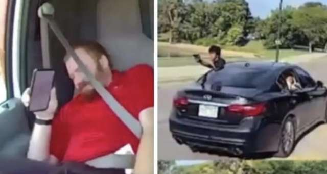 The dashcam video shows two men hanging out the window of a vehicle as they drive past, firing off at least five shots.