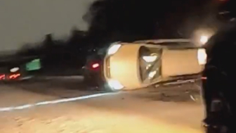 Car fails to move over and launches off tow truck ramp nearly hitting workers