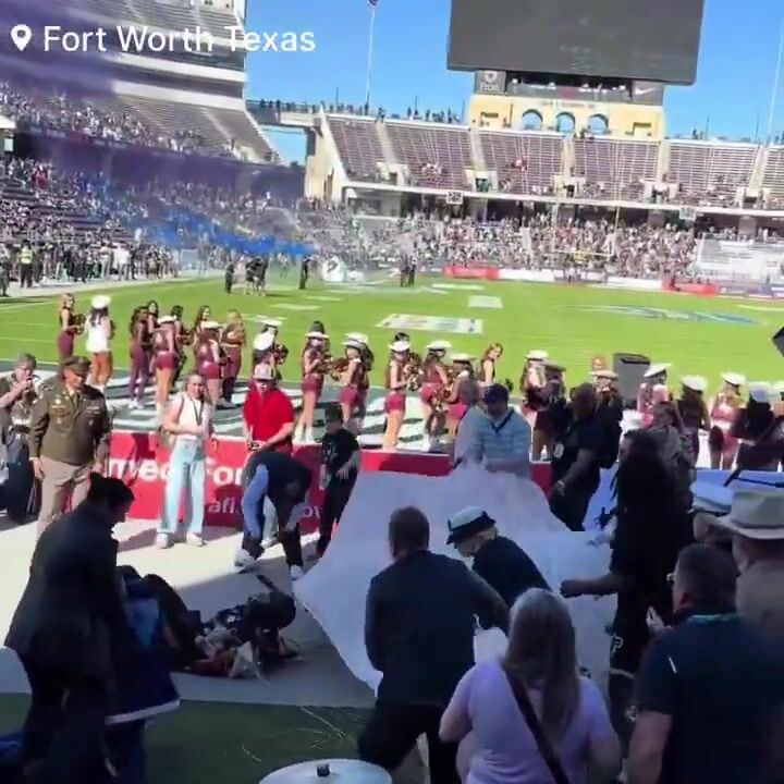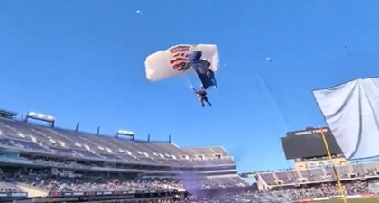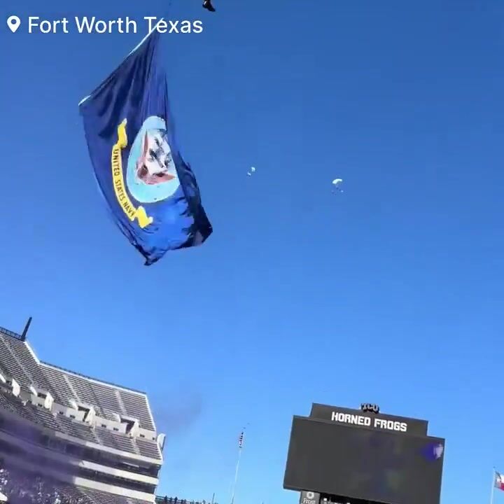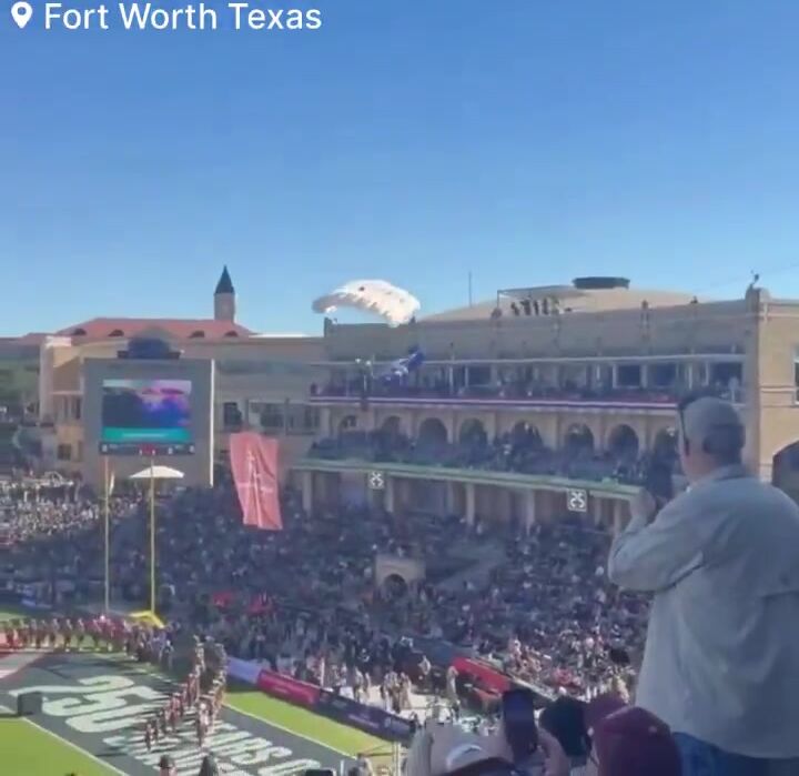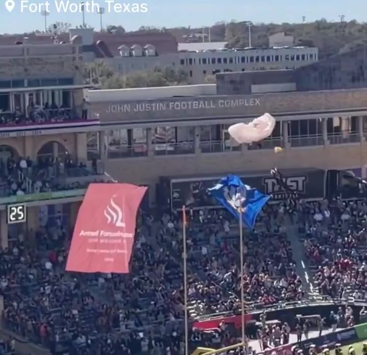 Officials say that Five parachutists were scheduled to land on the field ahead of the Rice vs. Texas State matchup in Fort Worth, Texas. However, reports indicate that only three landed safely in their intended locations. One parachutist was caught in the netting above the end zone, while another reportedly touched down outside the stadium. According to the officials the parachutist who fell was able to stand up and walk off the field under his own power. No serious injuries have been reported at this time.