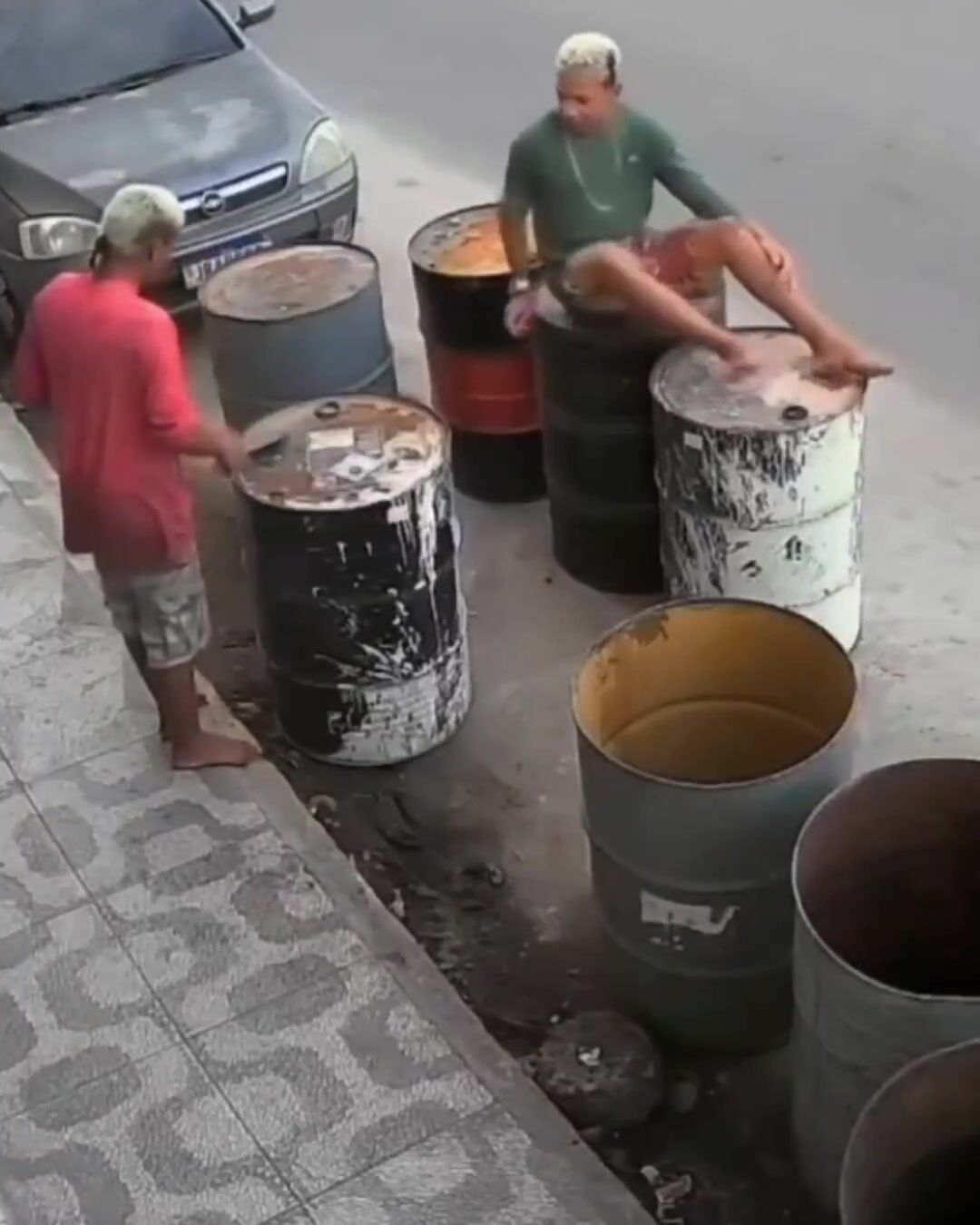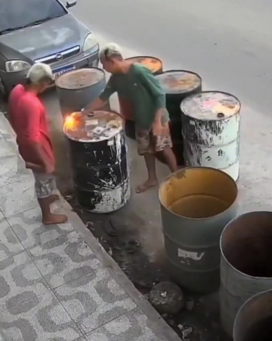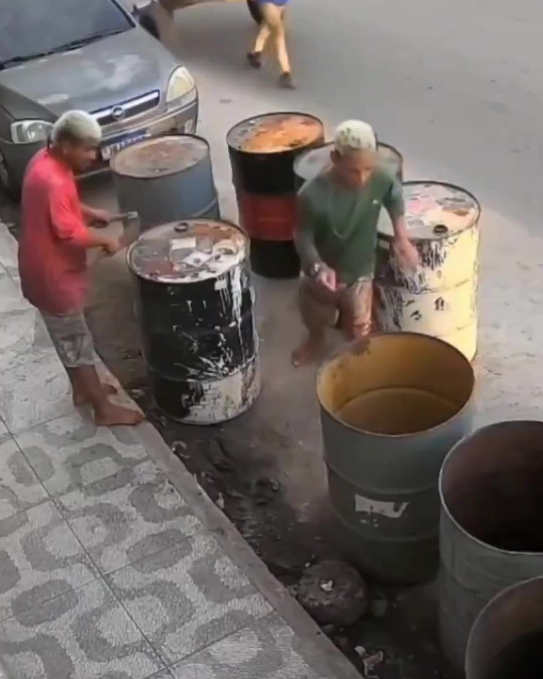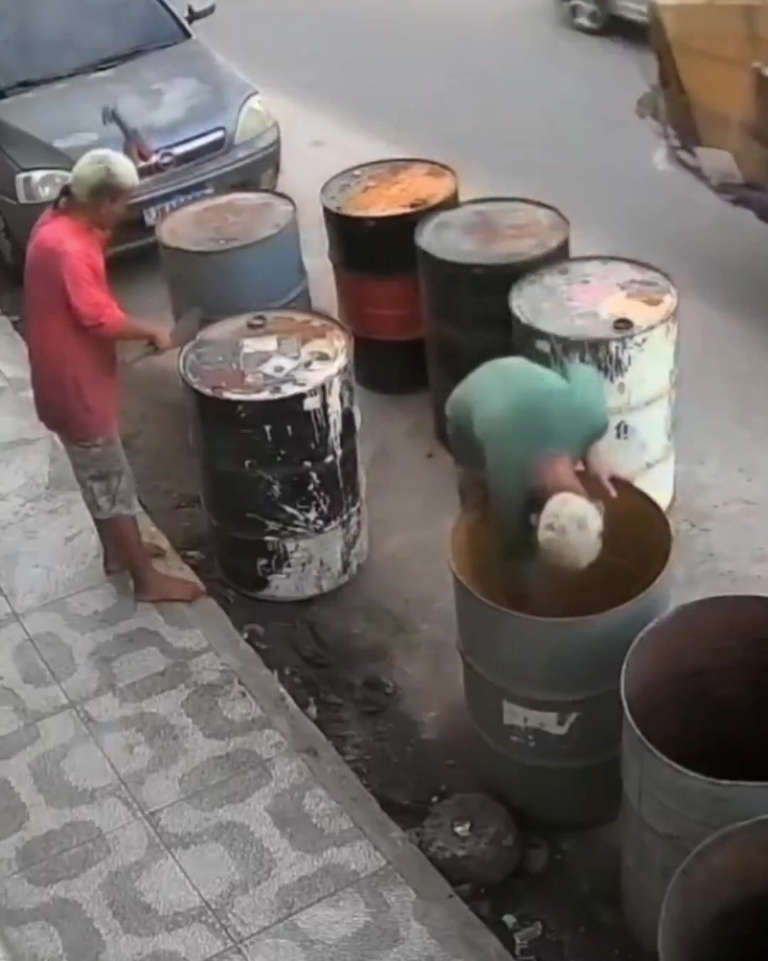 The whole thing was caught on CCTV and has gone viral online. Both were treated at a local health unit, and no one knows yet what was inside the barrels.