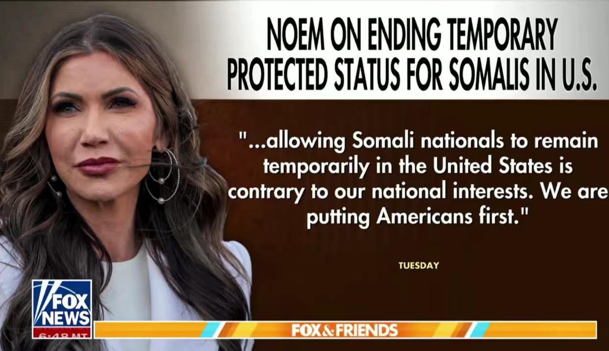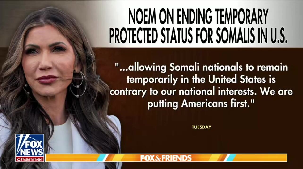DHS Secretary Kristi Noem told Fox News: “Temporary means temporary. Country conditions in Somalia have improved to the point that it no longer meets the law’s requirement for Temporary Protected Status.”