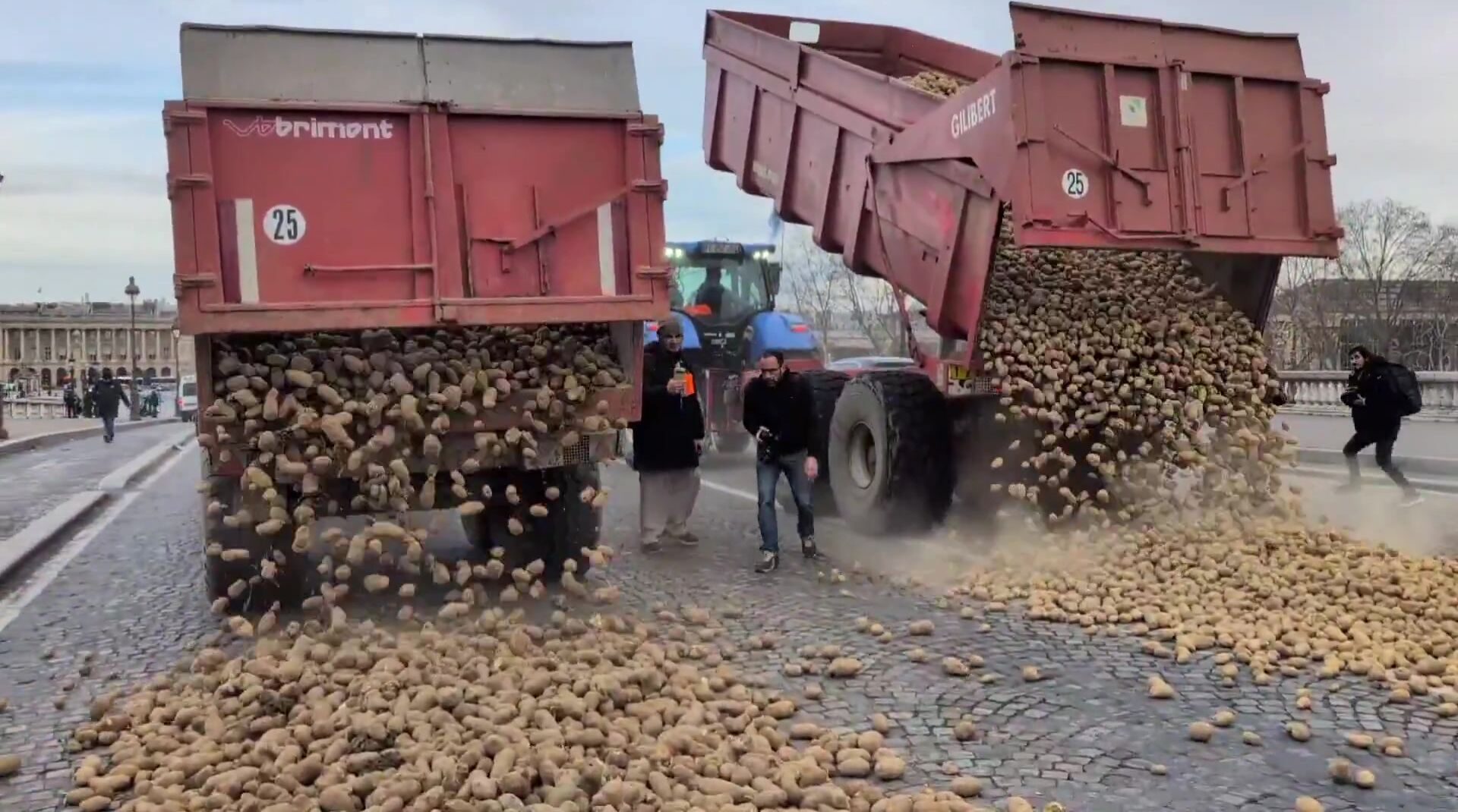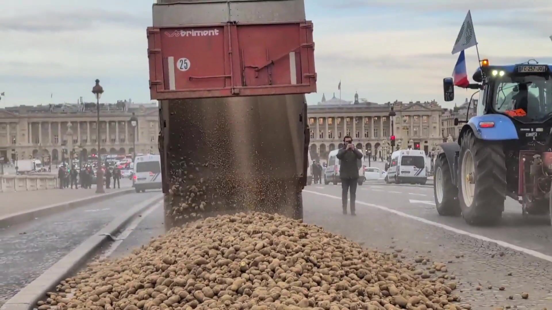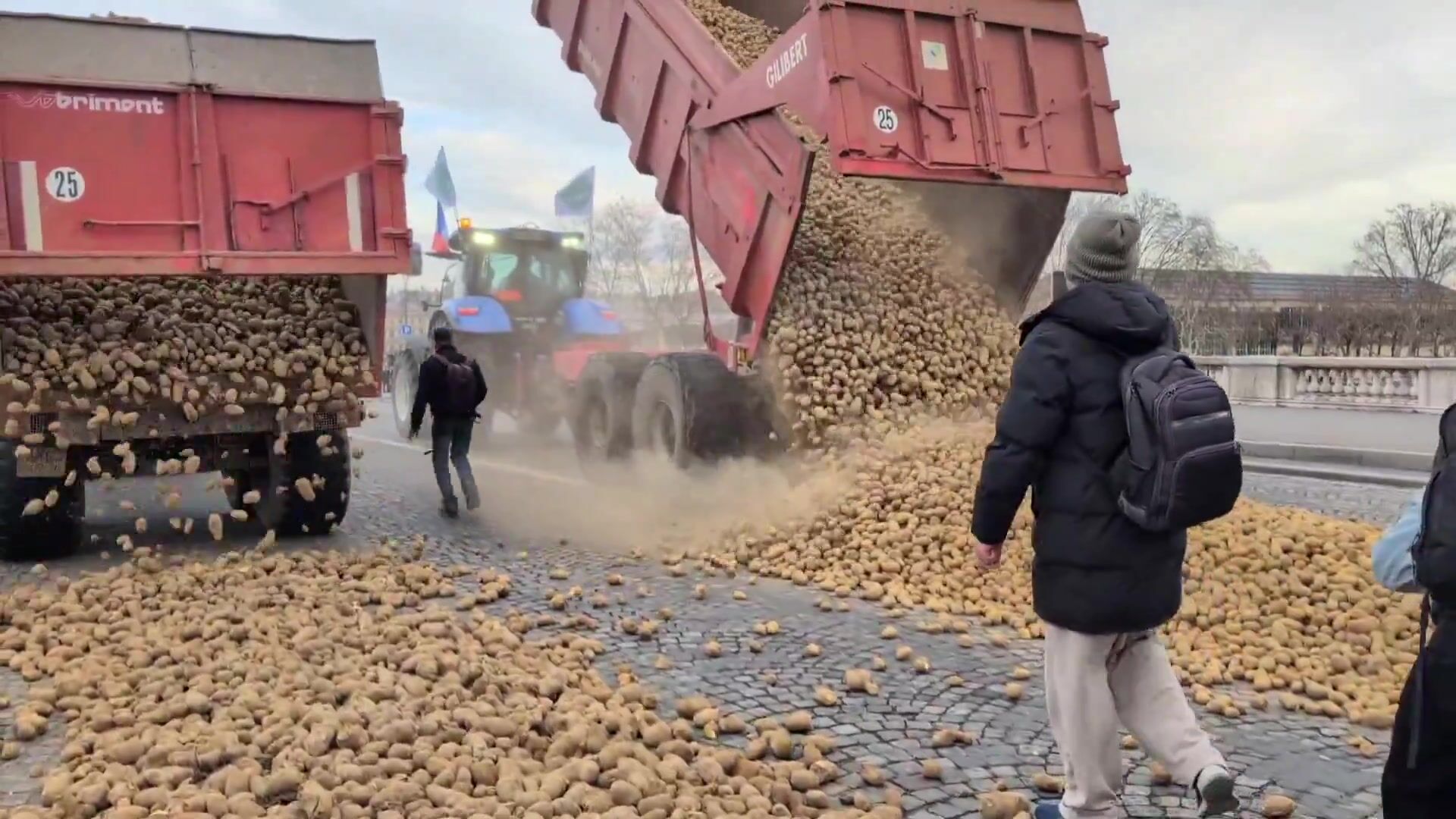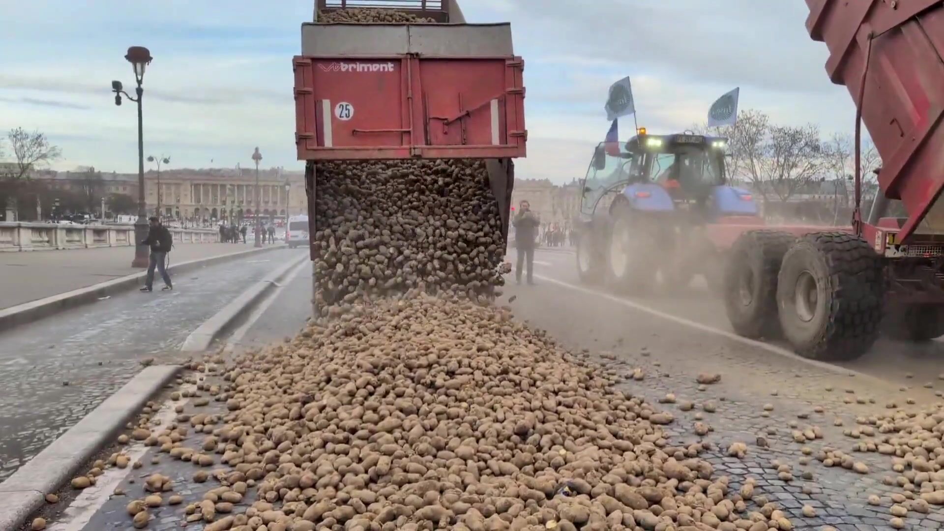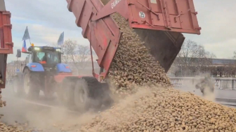 French farmers dump potatoes in front of the French Parliament