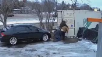 The two agents walk toward a storage unit and removed the man, identified as "Kevin," from it. According to the GoFundMe, the man is in the U.S. legally on a work permit. As he’s being pulled out of the storage unit, he screams "Ayuda!" the Spanish word for help, multiple times.