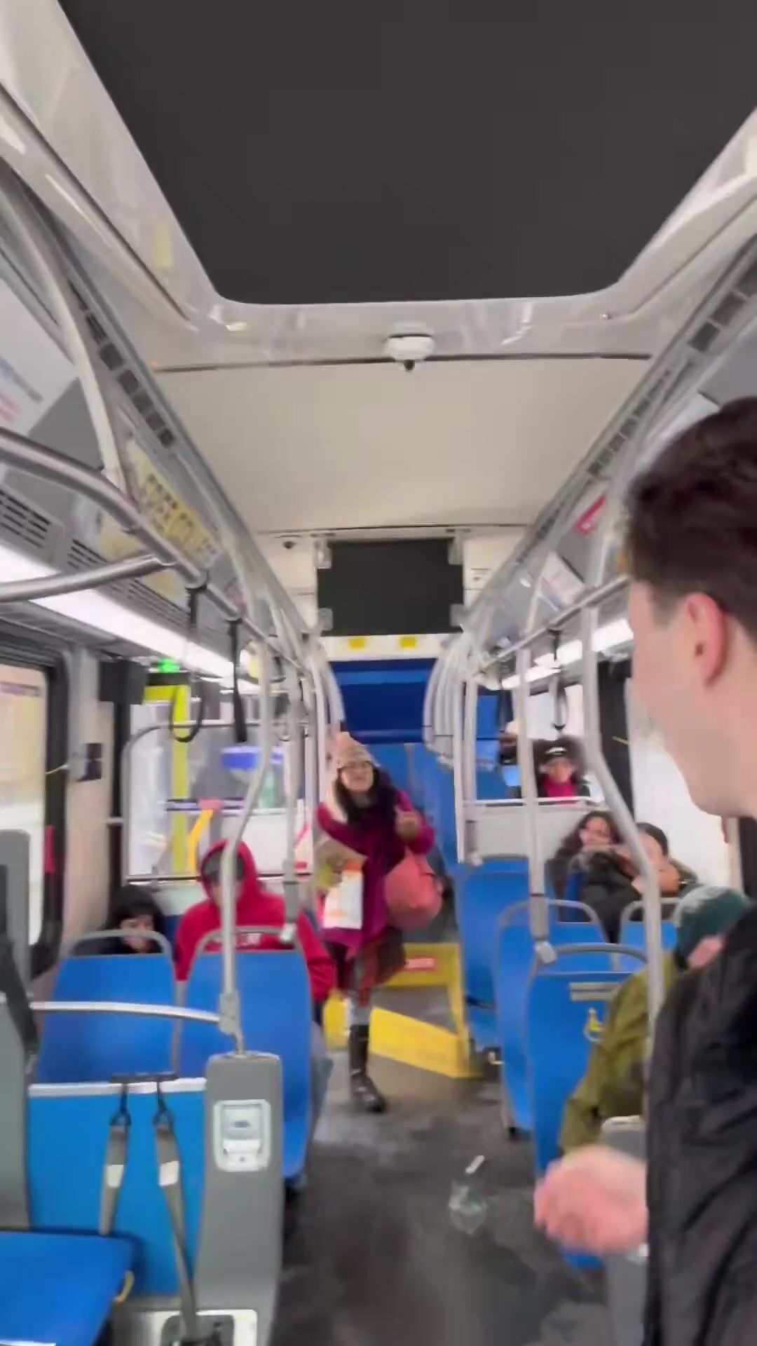 She temporarily retreated but got back on the bus and approached us again. While I tried to reason with her she pepper sprayed me directly in my face and attempted to attack me again. The bus driver then kicked her off the bus and drove away.