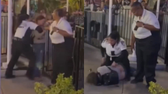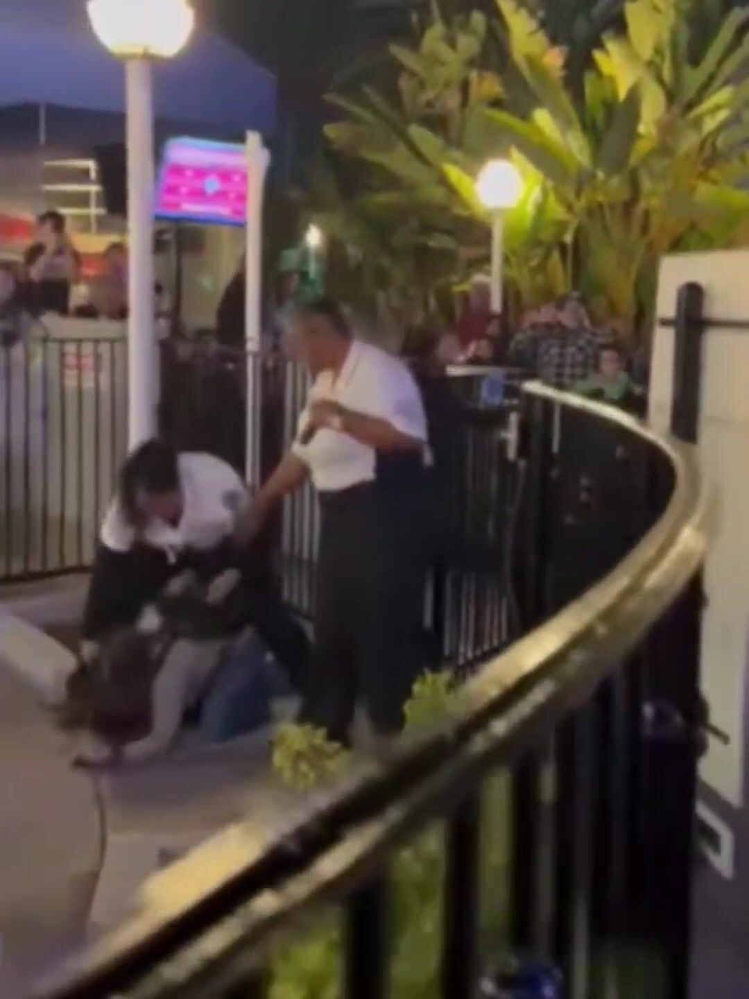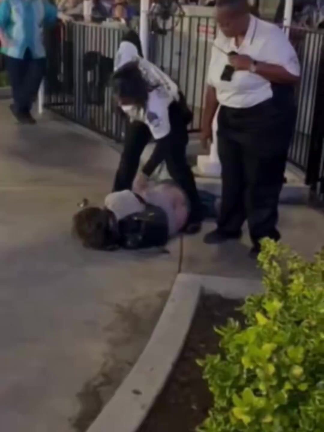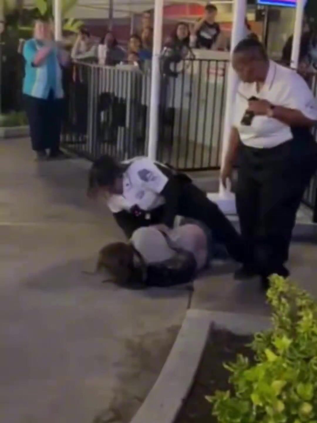 Video shows two guests and a security guard involved in an altercation near an outdoor entrance area at the park as a crowd watches and cheers from behind metal barricades. Several bystanders can be seen recording the scene on their phones.