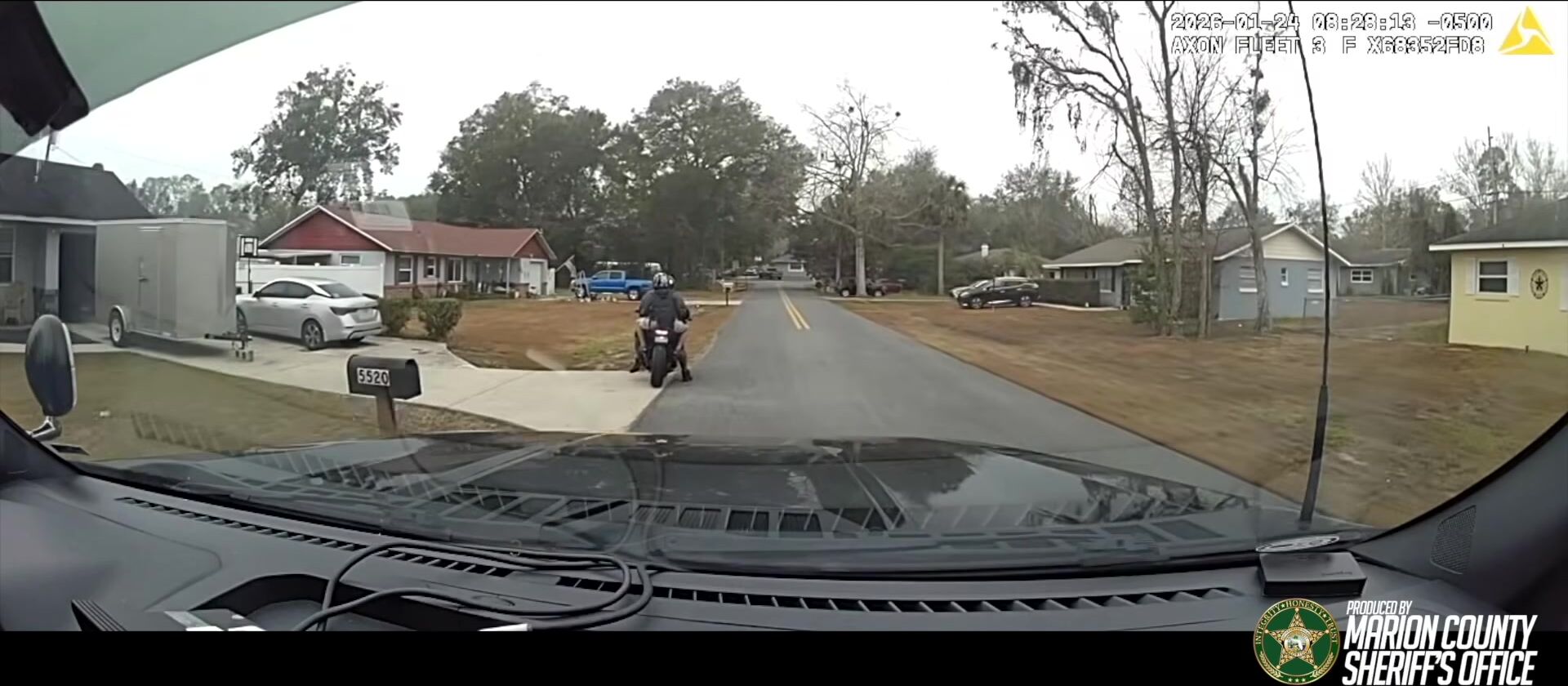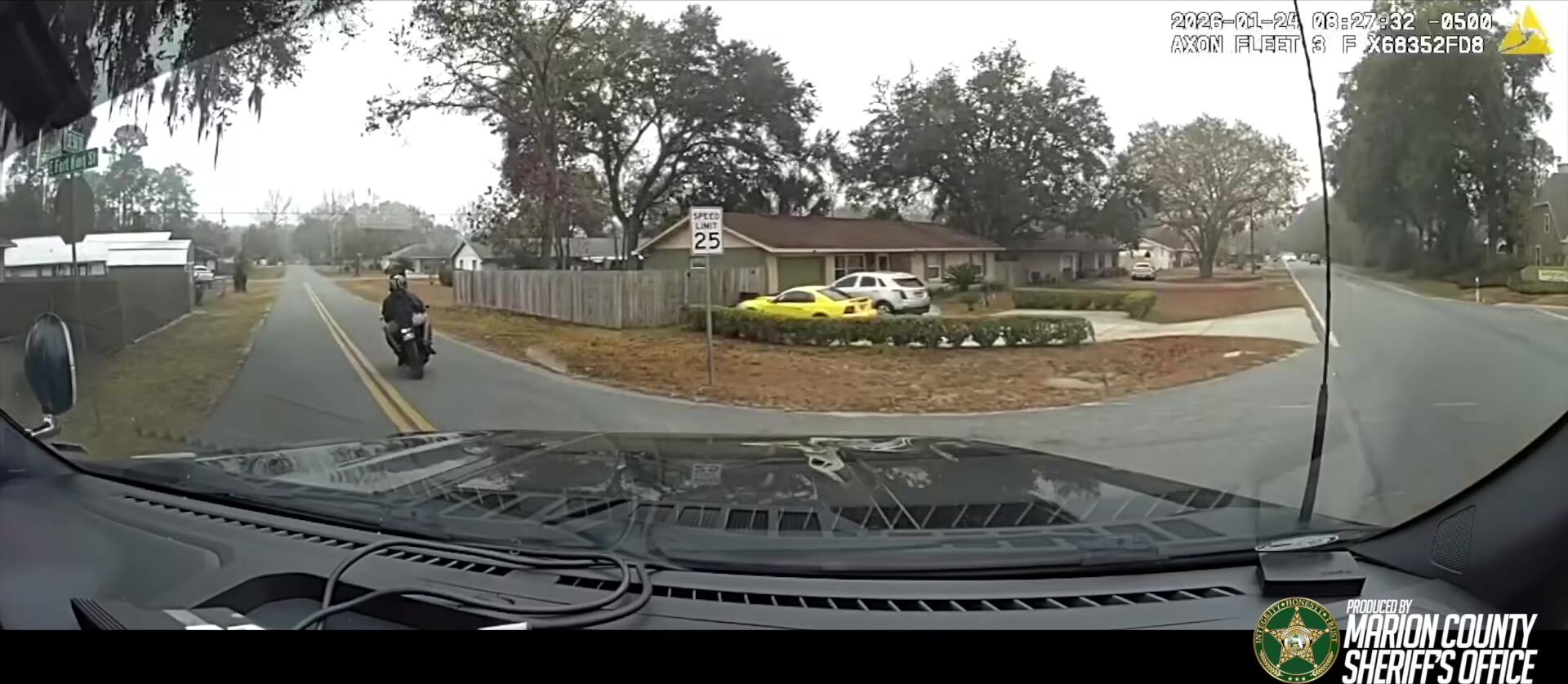 On January 24, 2026, Traffic Cpl. Miranda was conducting speed enforcement when he observed a black motorcycle traveling more than 105 MPH in the 1600 block of SE 58th Avenue — a posted 45 MPH zone. Cpl. Miranda initiated a traffic stop and followed the motorcycle through multiple turns in a residential neighborhood before it finally stopped at a residence.