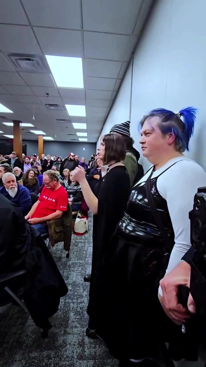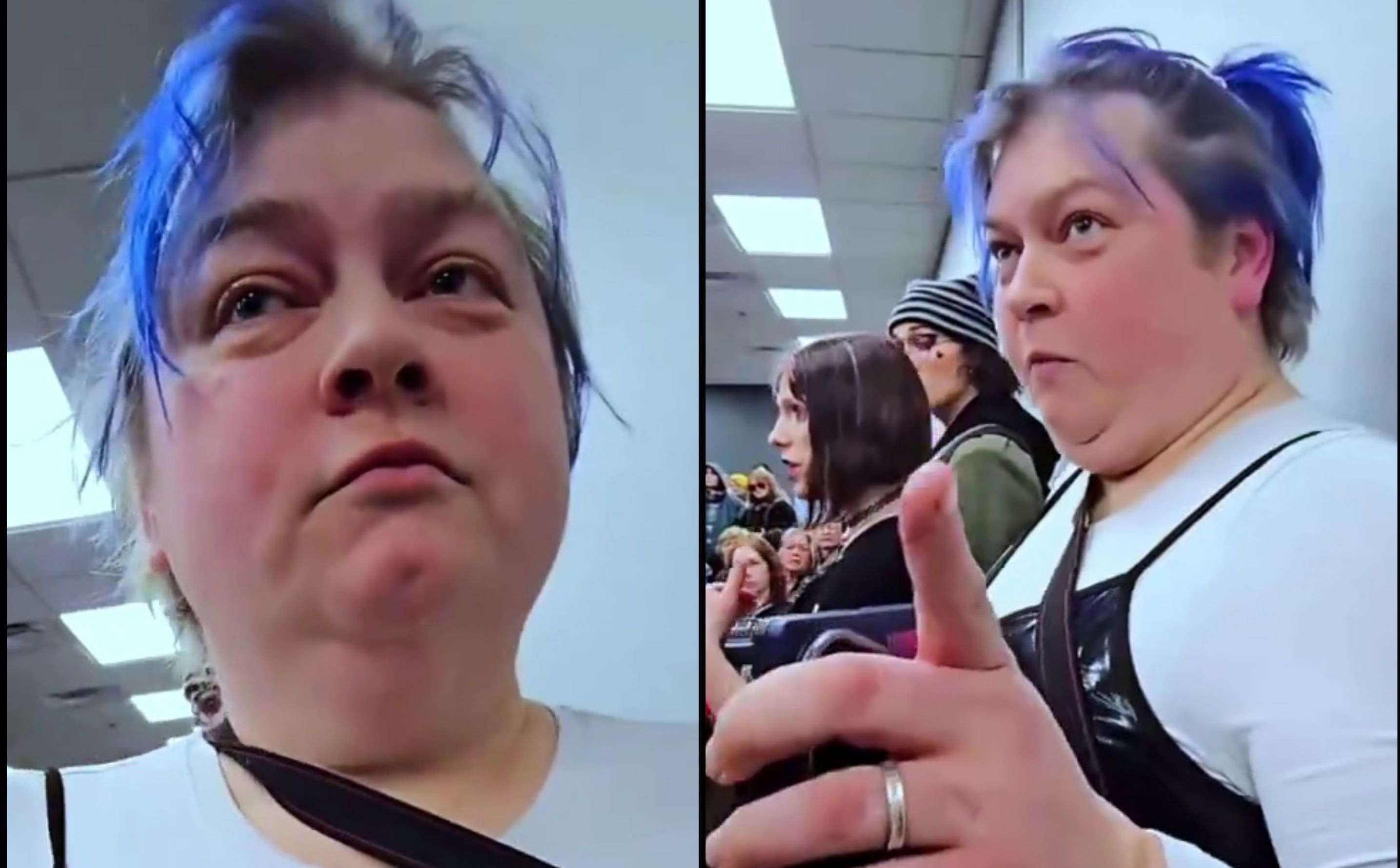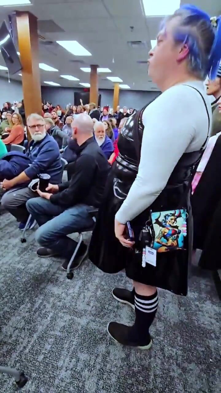 A blue-haired fag in latex dress aggressively confronted attendee at Minnesota Town h