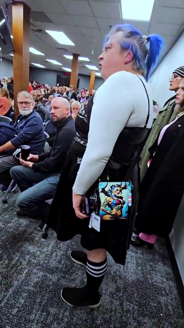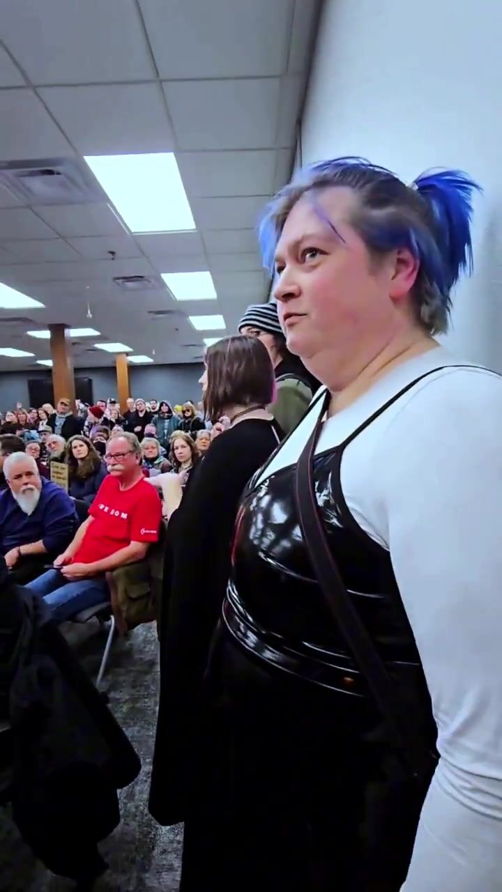 A large, blue-haired man in a latex dress aggressively confronted an attendee at a Minnesota town hall, allegedly threatening them for recording the event.