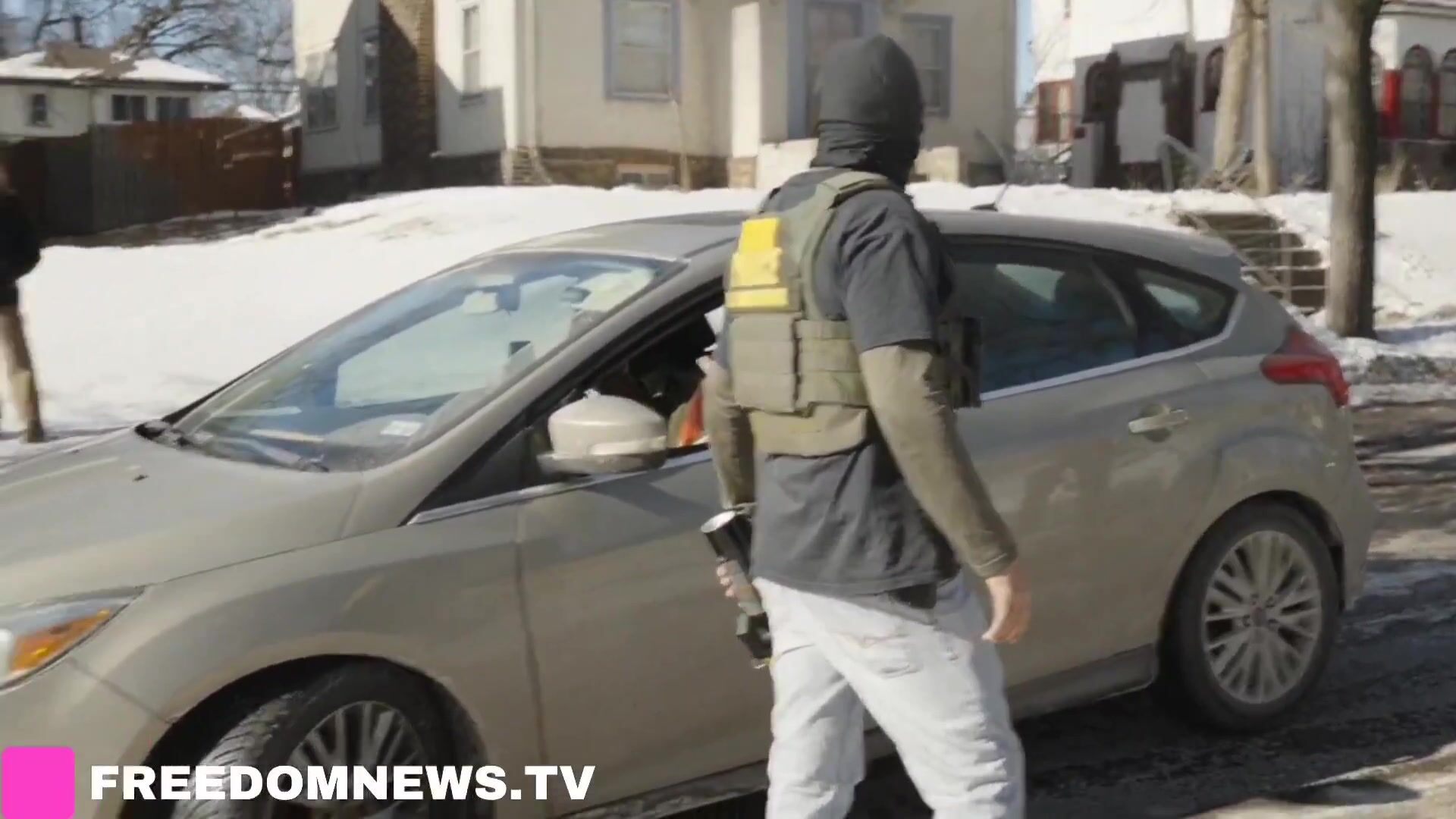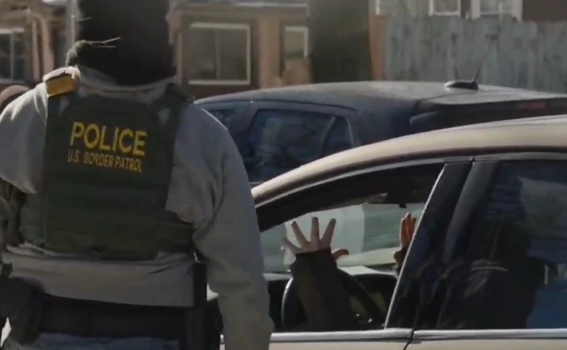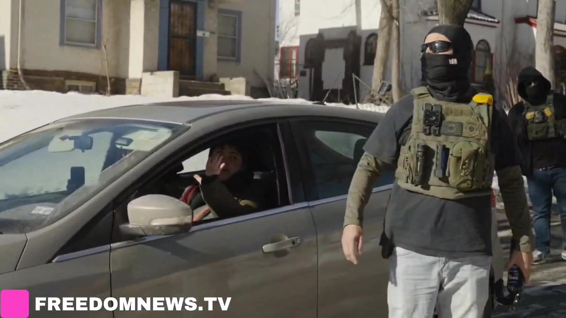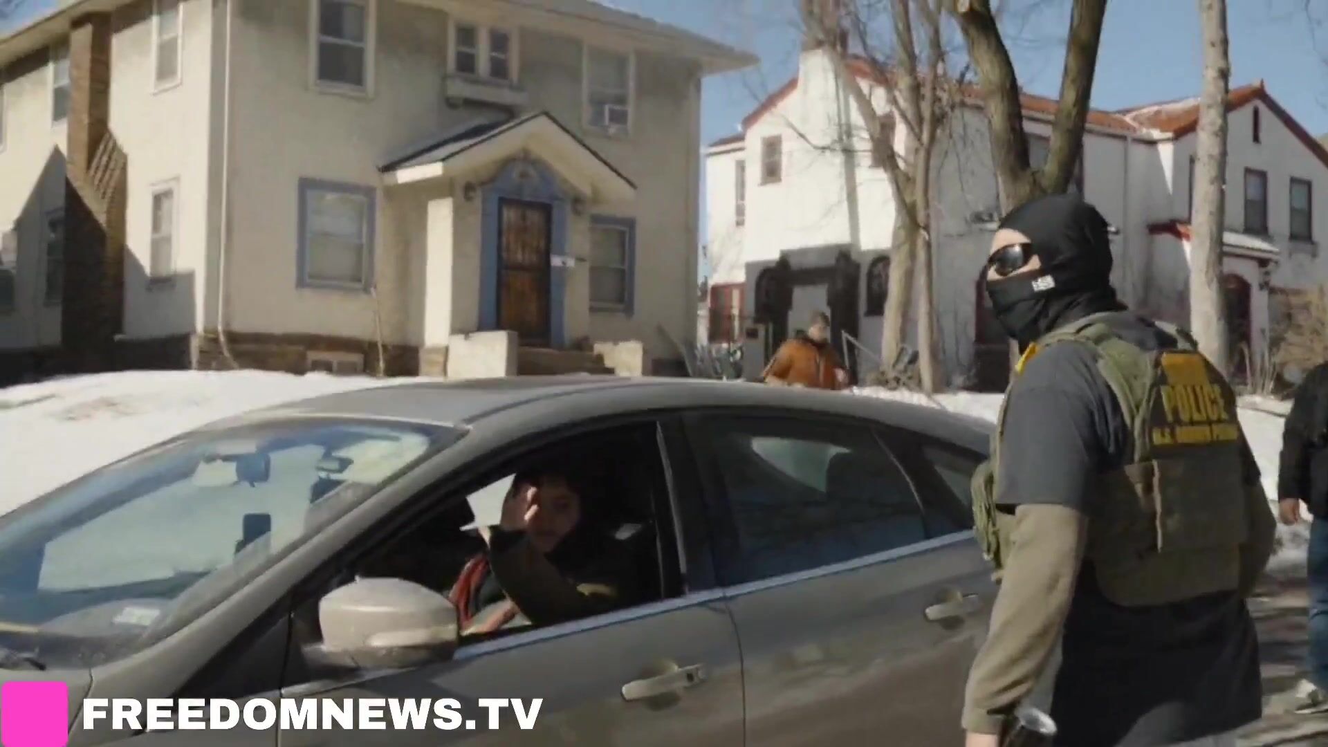 Anti-ICE protesters hold their hands up as federal agents demand they stop tracking them in North Minneapolis.