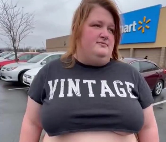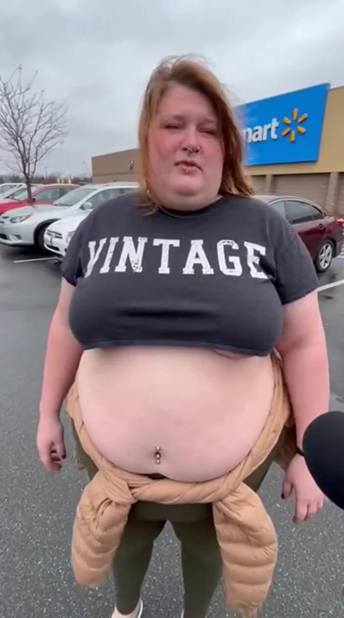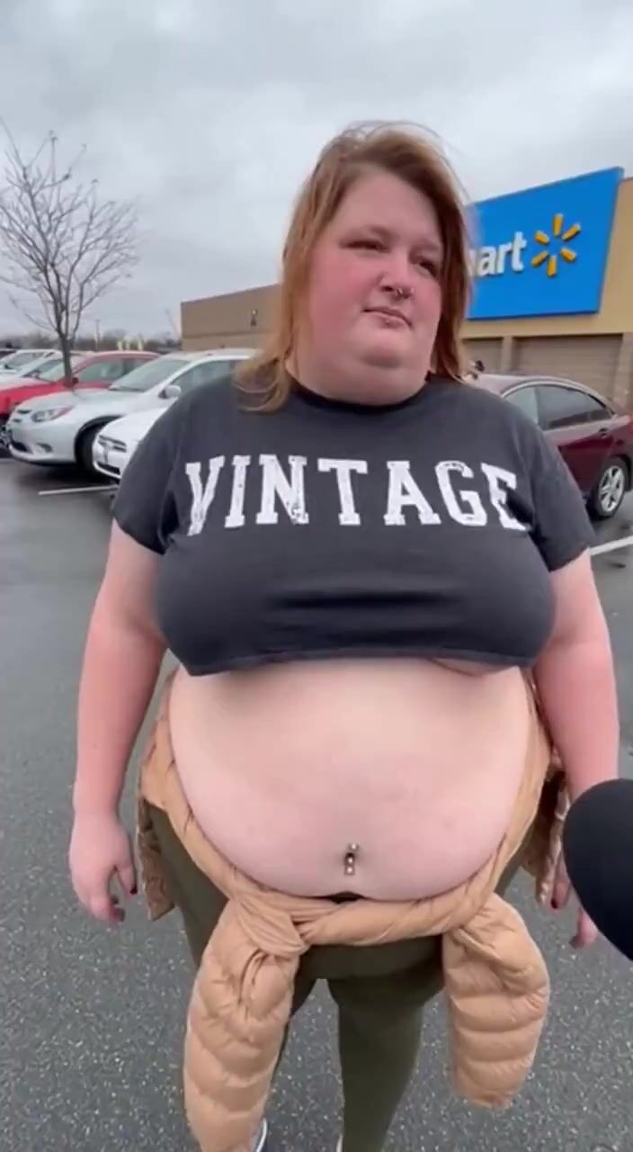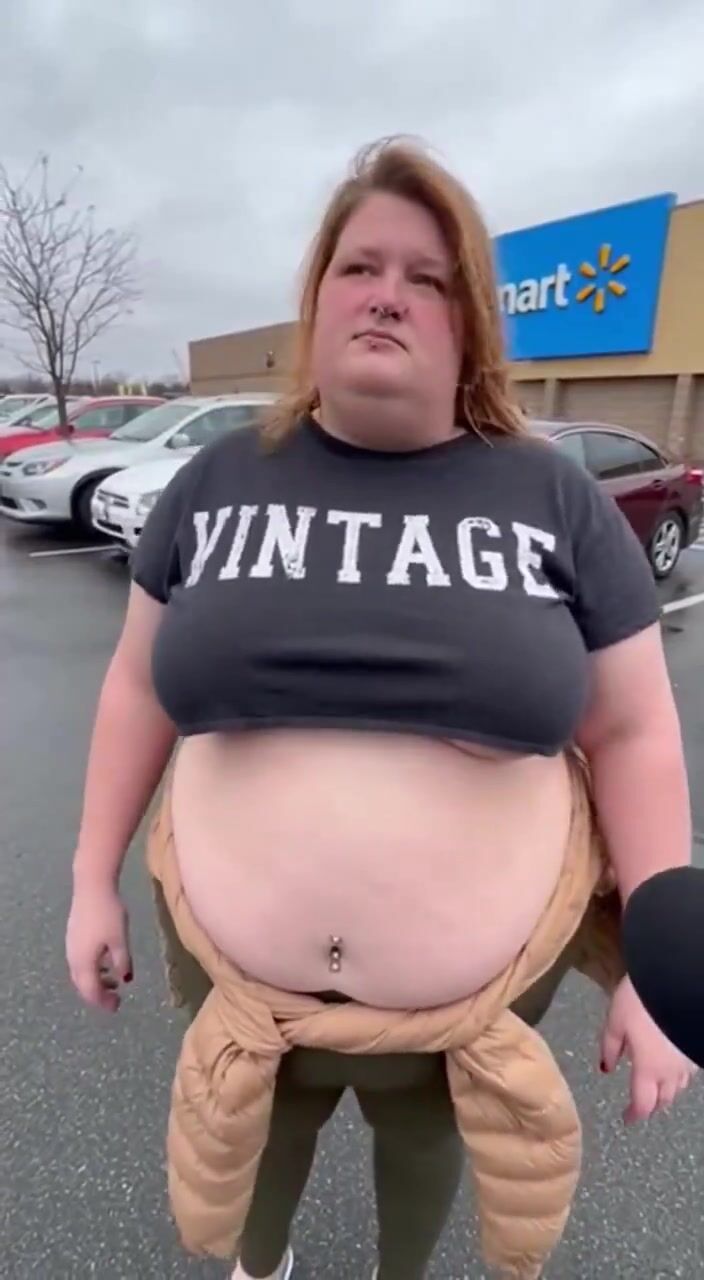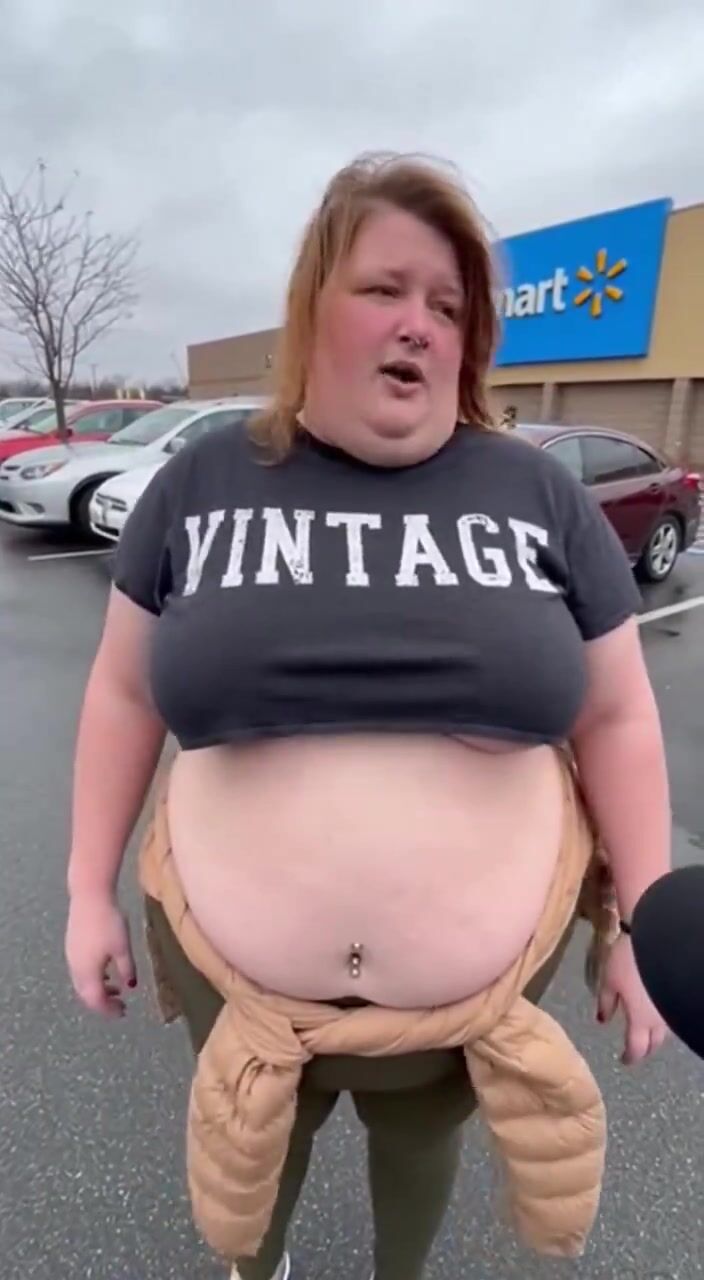Wow, I don't know what's more shocking, seeing a K-Mart still in existence or this big ole whale has belly button piercings. Every time she sits down, some poor soul could catch a stray.