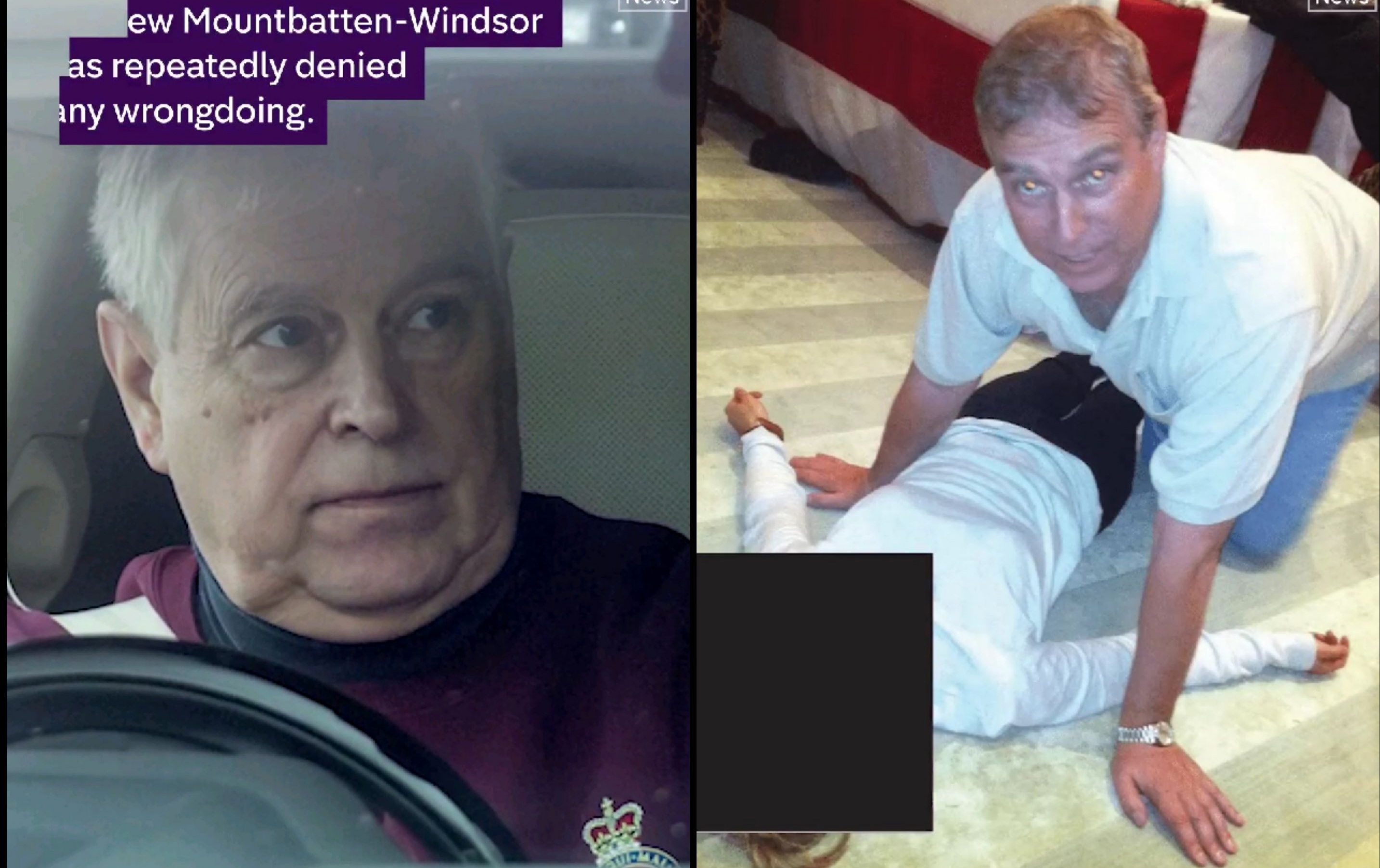 Photos included in the latest Epstein files, released by the US Department of Justice, appear to show Andrew Mountbatten-Windsor on his hands and knees over a female lying on the floor.