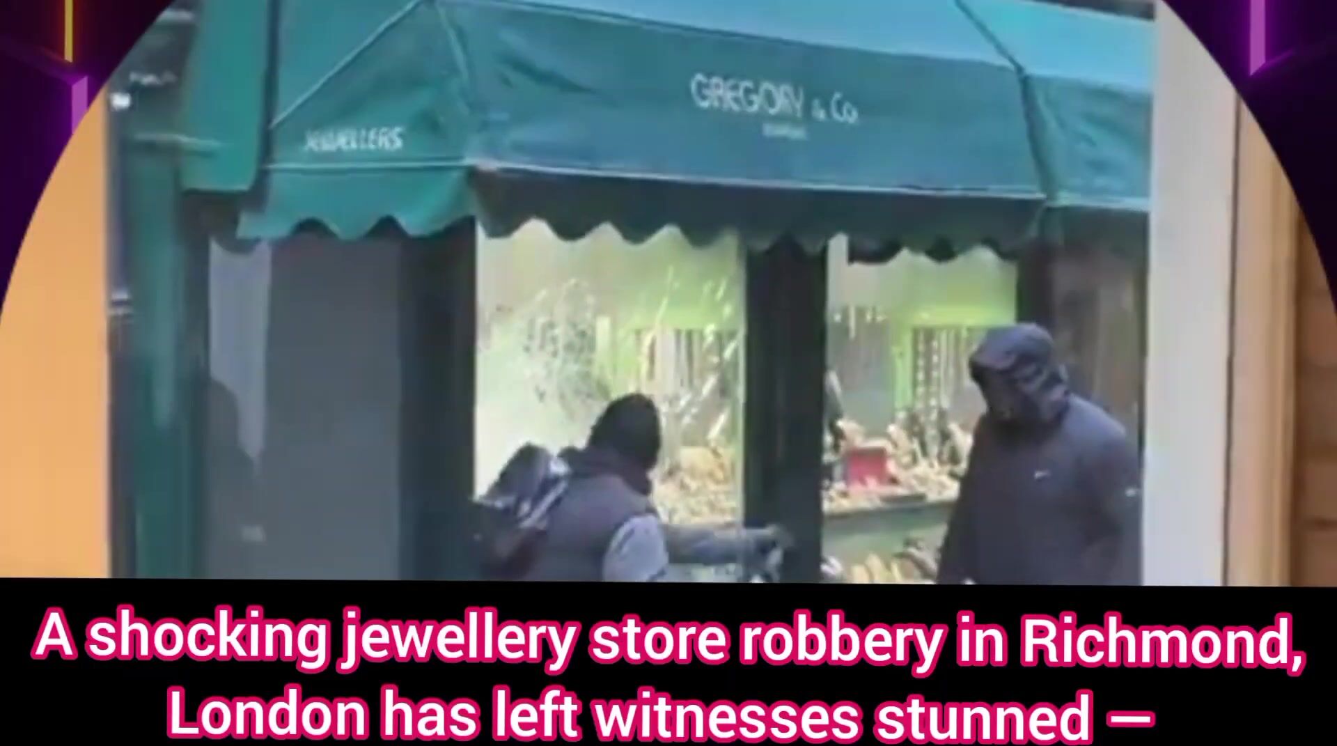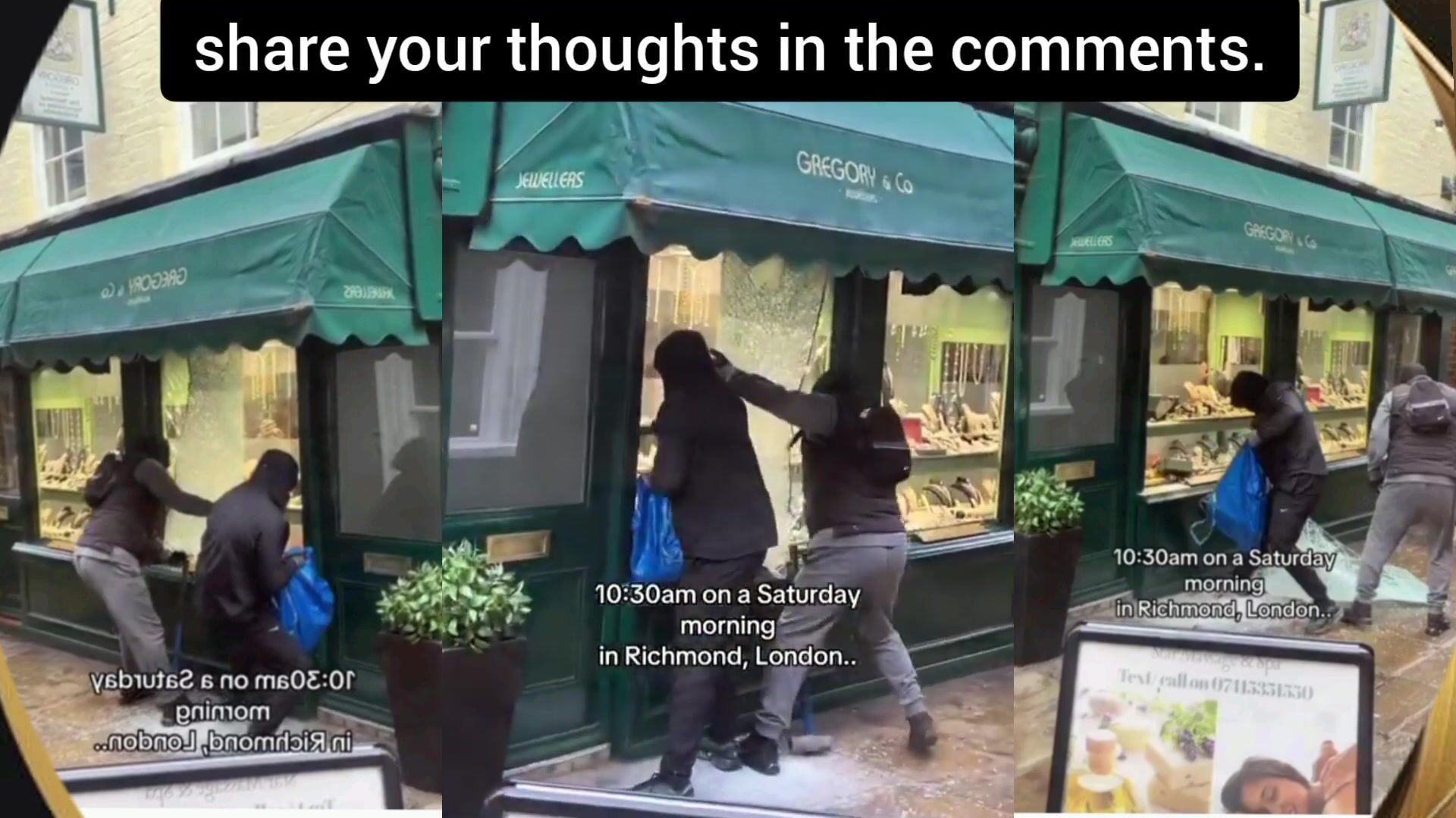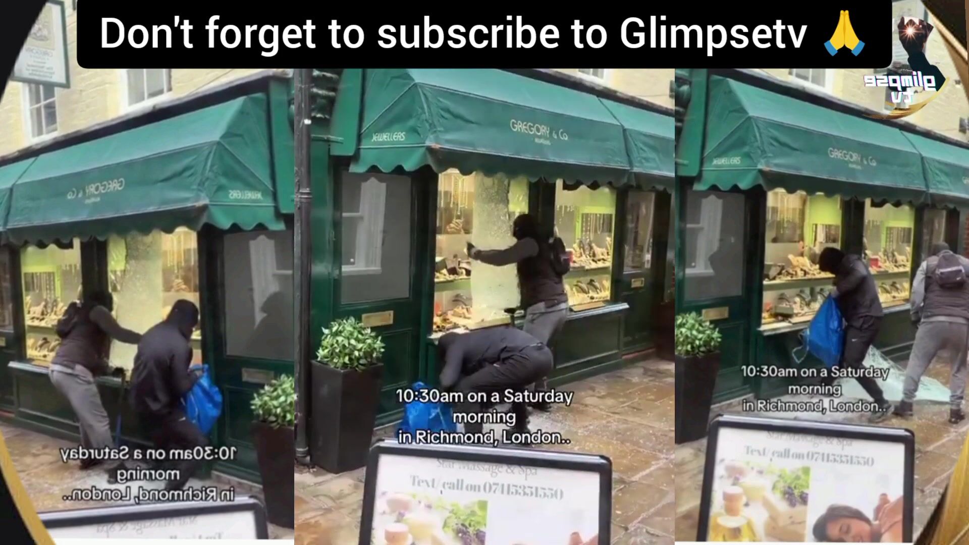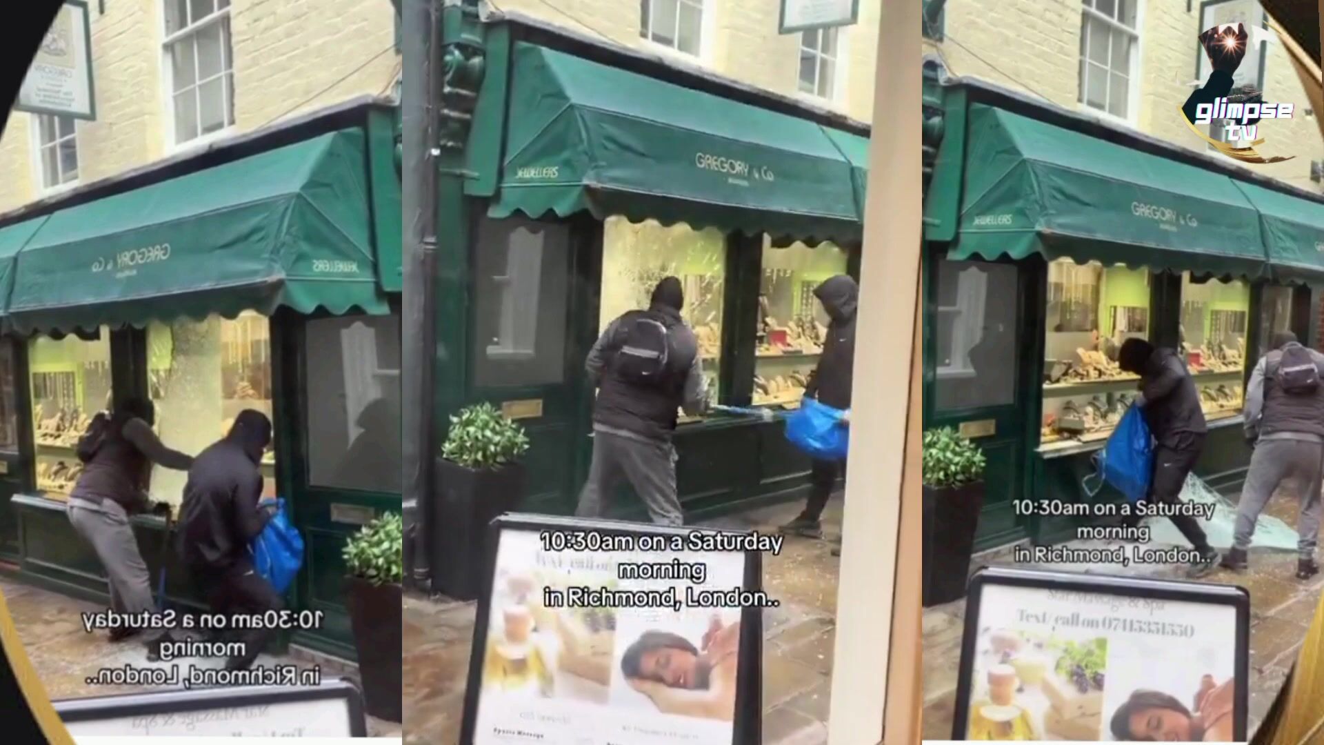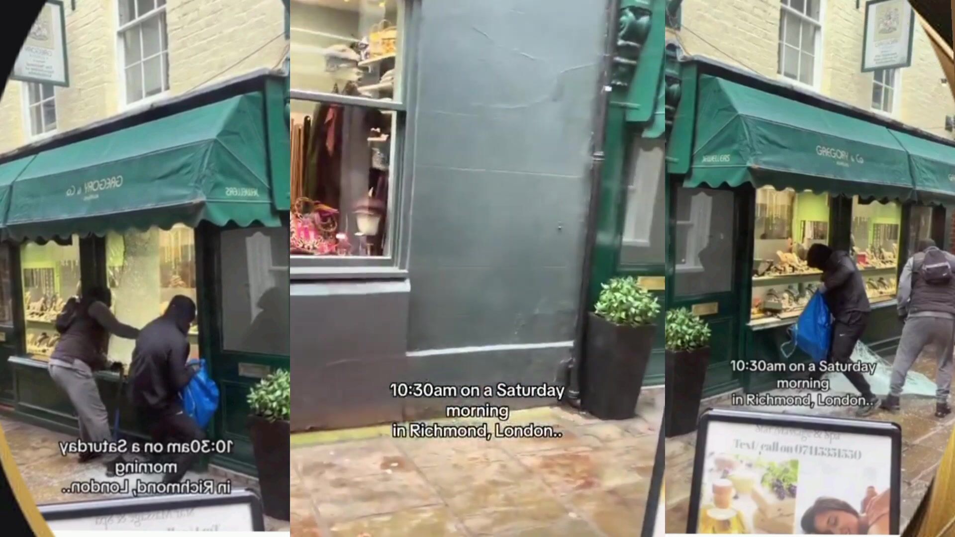 Burglars shattered the front window of a west London iewellers before making off with several items as staff tried to stop them. Footage from social media shows two masked men use a hammer to smash the window of Gregory & Co iewellers in Richmond before pulling off the damaged glass As they scooped up items, one staff member was seen trving to bat the burglars away with a small box while another attempted to remove items from the window display The Met Police has appealed for witnesses to the burglary which it said happened at about 10:30 GMT on Saturday