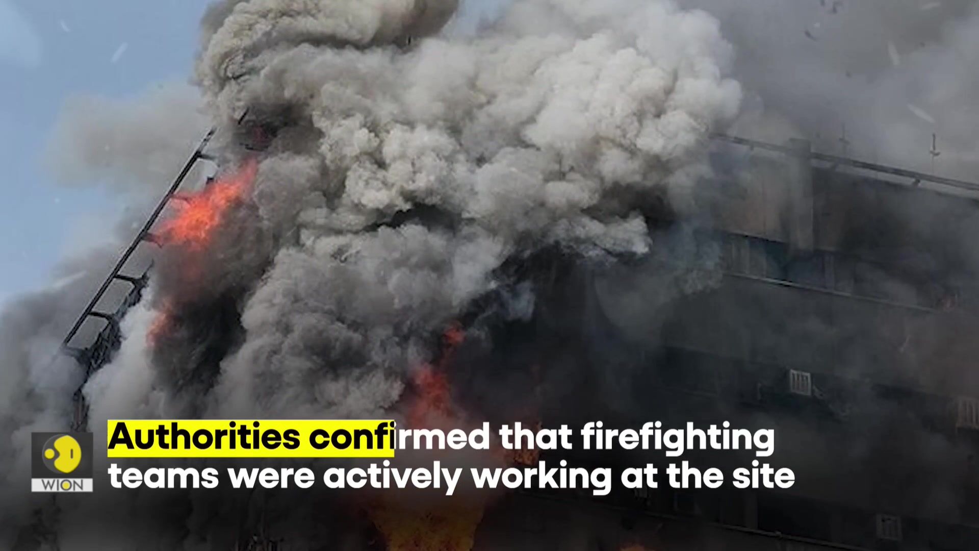 Other angles show traffic slowing on the highway adjacent to the building due to the thick clouds of smoke.