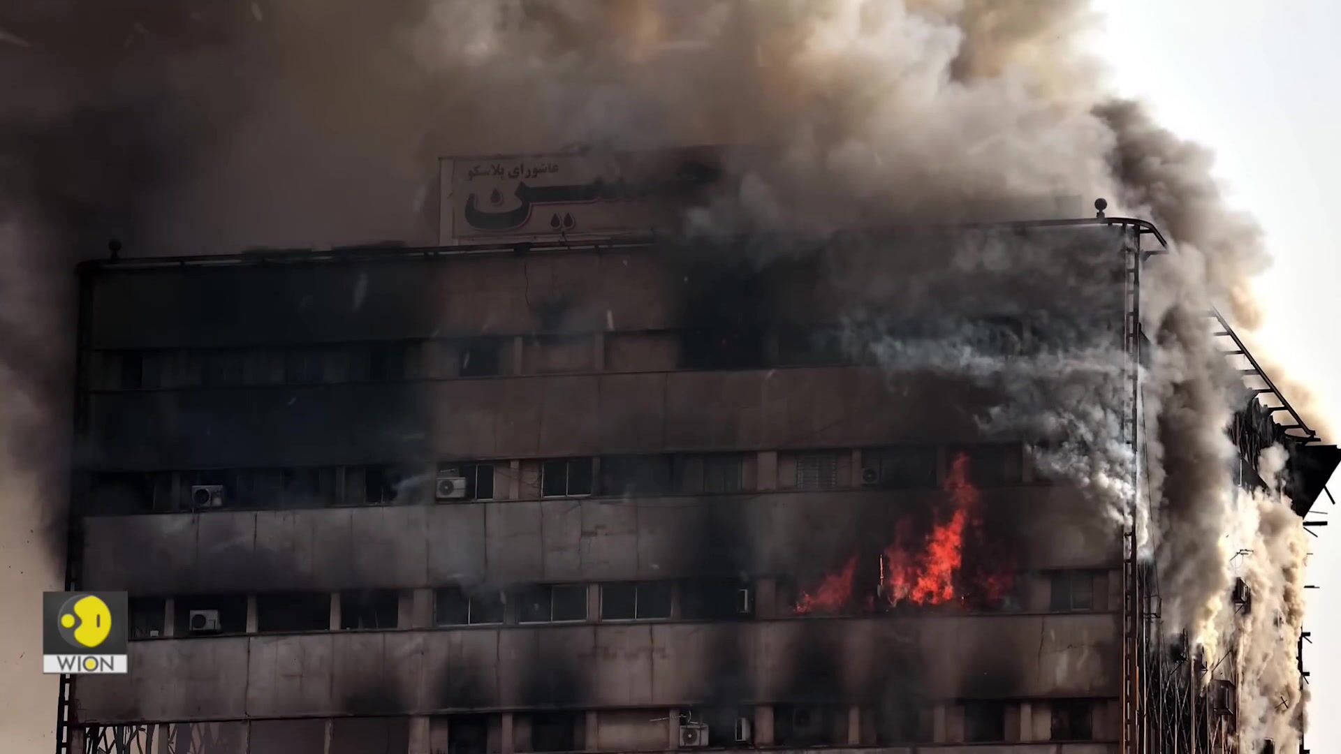 Another verified video, filmed from above in the next door Niayesh Mall, shows the market covered with huge smoke plumes and enormous flames ripping through the building.