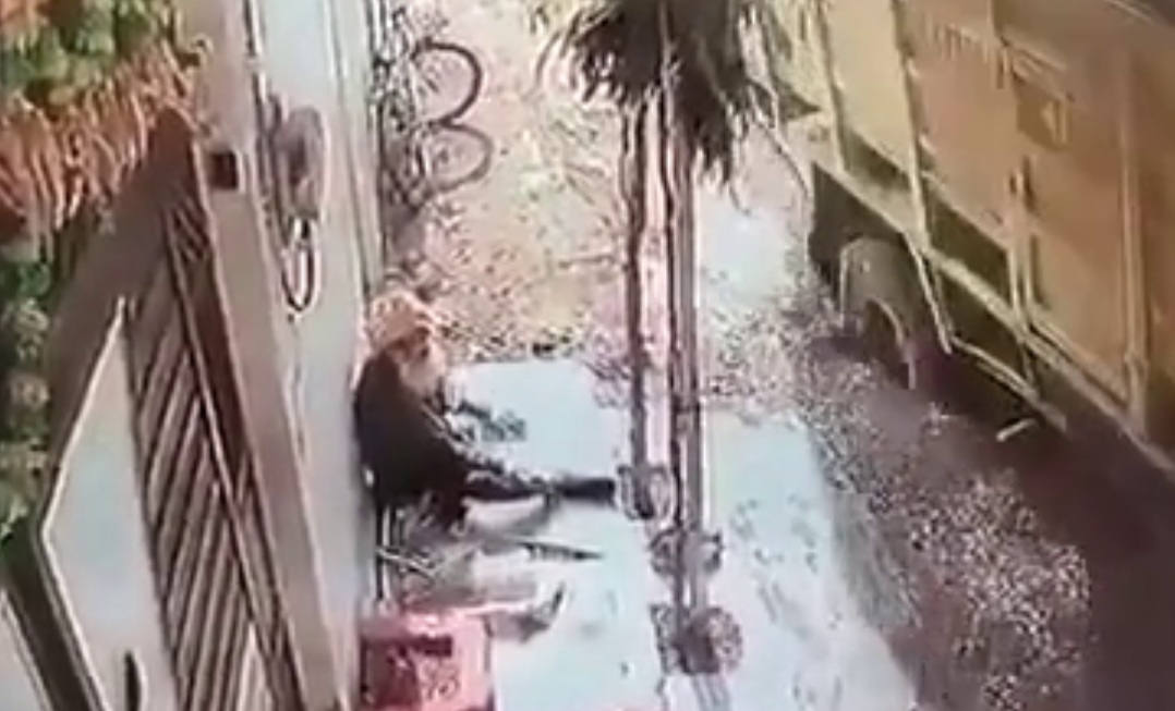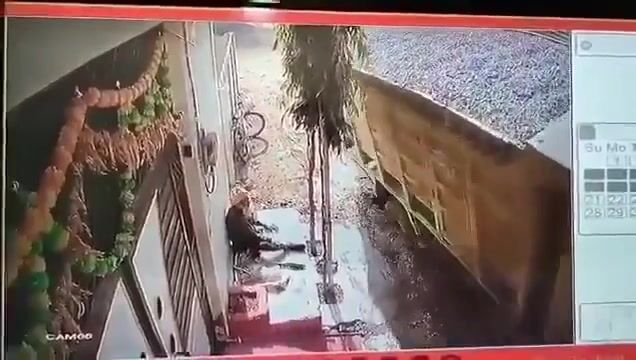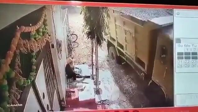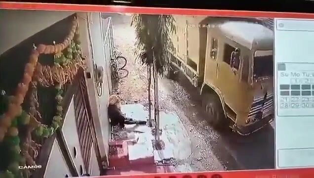 He survived. The truck fell against the wall just above his head as he ducked down. The wall also acted as a barrier to the load of stones on the truck. He crawled out shortly after to the amazement of his neighbours. (I don't know this, I'm just guessing).