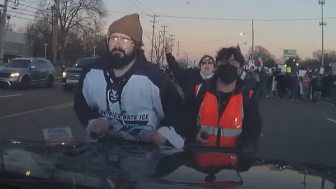 However, the footage shows 3 people jumping in front of a police car and 1 person flopping onto the hood of the vehicle.