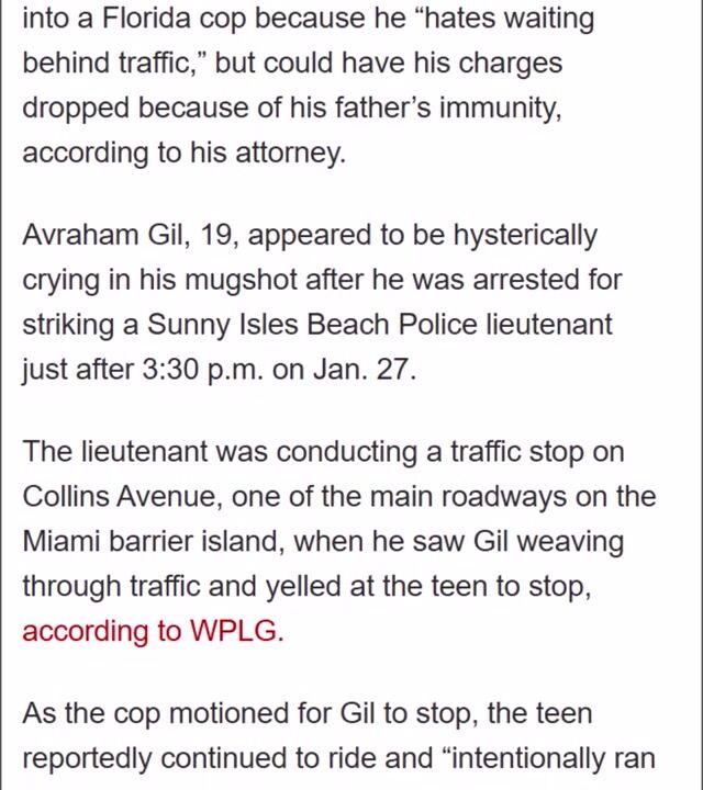 Incident: In January 2024, Avraham Gil (then 19) was riding his motorcycle when a police officer, Lt. Ruben Zamora, attempted to stop him for weaving in and out of traffic. Gil ignored the orders and struck the officer, injuring his leg. Resolution: Gil eventually reached a pre-trial intervention agreement with prosecutors, which the victim, Lt. Zamora, reportedly approved. The conditions required Gil to complete 100 hours of community service, attend traffic school, donate $500 to a trauma center, and not drive. Outcome: After fulfilling these requirements, the remaining charges of aggravated assault on a law enforcement officer were dropped, and Gil avoided jail time. He and his family left the U.S. for Israel as their visa was set to expire