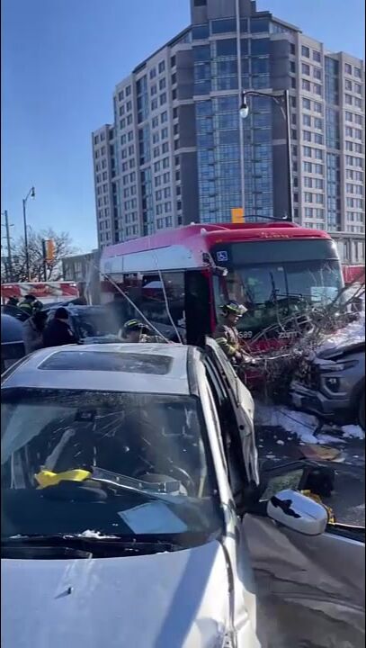 10 people taken to the hospital following crash involving transit bus in Brampton.