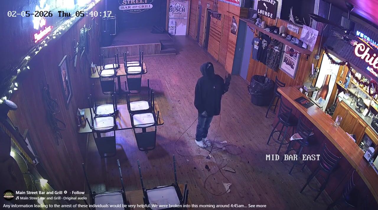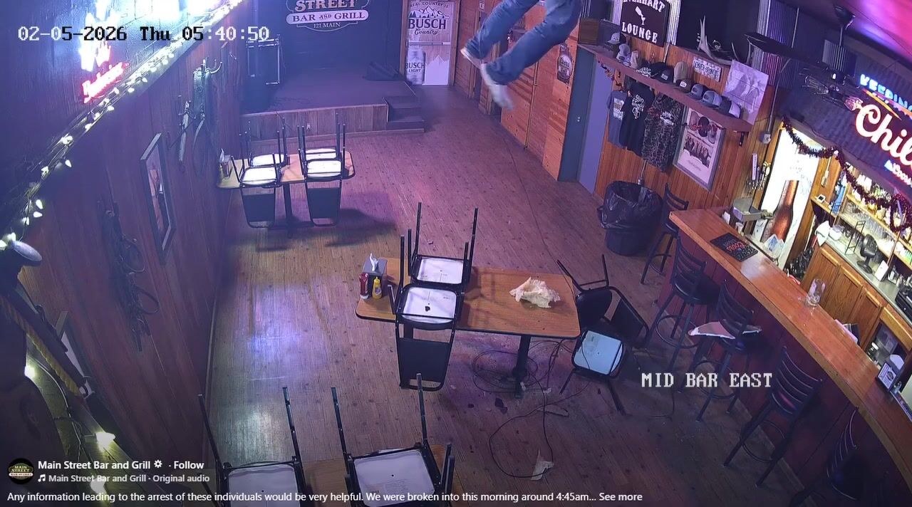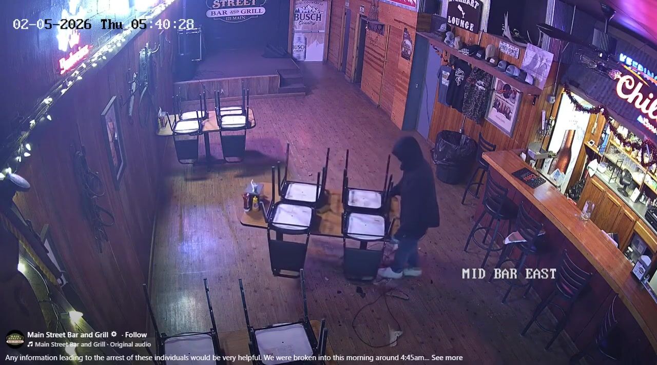 Main Street Bar and Grill in Canton shared videos on social media Thursday, saying two people broke into the business through the ceiling around 4:45 that morning. Both individuals are wearing blue jeans, dark coats and have their faces covered. One of the suspects appears to have a tattoo on their lower back.