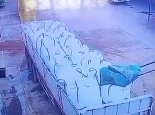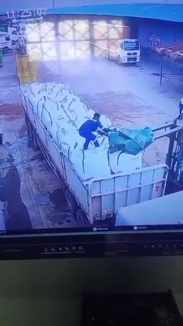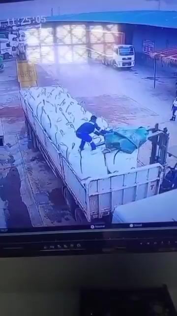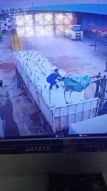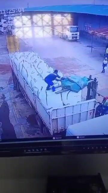 CCTV footage captures the moment a truck driver fell from the top of his vehicle while attempting to pull the truck cover over goods loaded by a forklift, slipping and injuring himself after losing his grip.