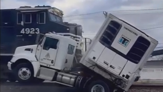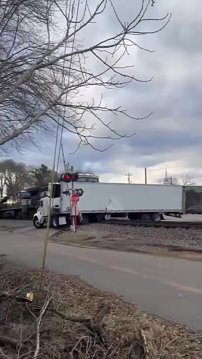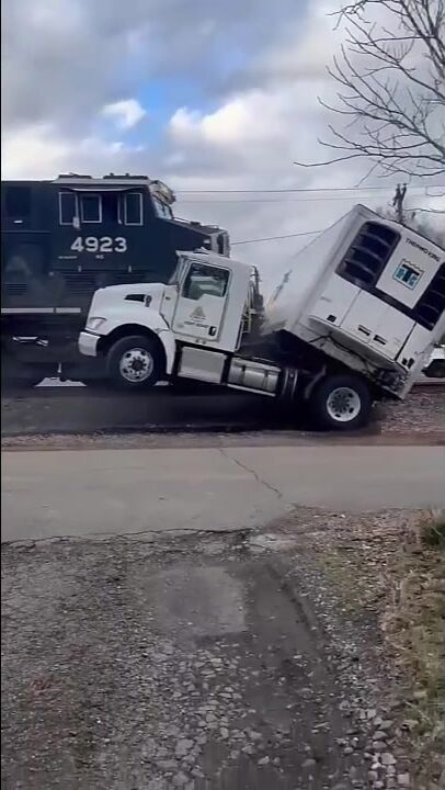 What trucker would try to cross a RR bed?? Pretty sure the train could have stopped too.