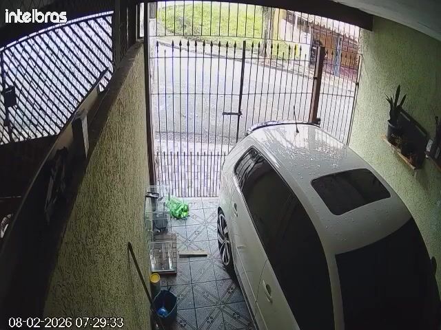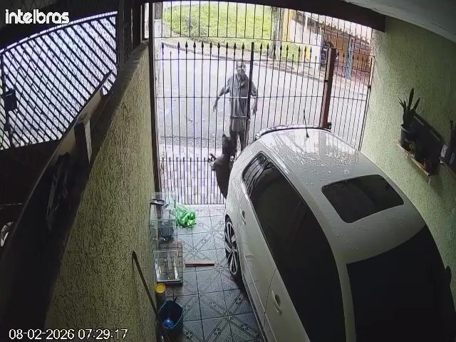 Initially, the images show two dogs inside a garage when a man, outside the house, appears with a tree branch in his hand. He approaches the gate and tries to steal an object from the garage. At that moment, the dogs react and bite the man's hand. In an attempt to escape the attack, the suspect pulls his arm away forcefully and ends up falling to the ground.