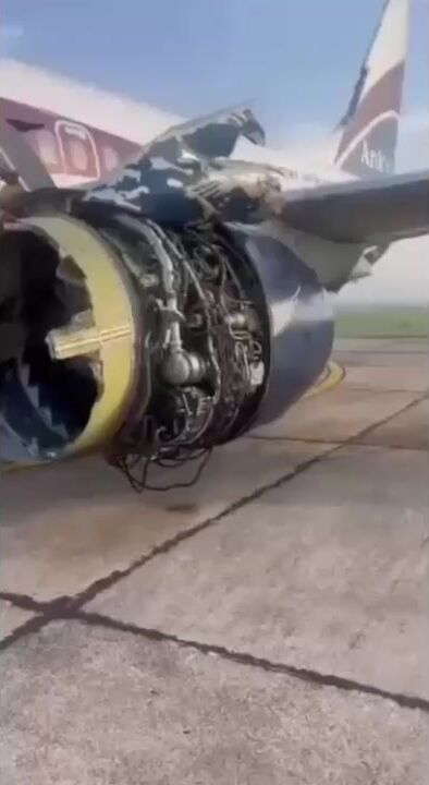 The Arik Air Boeing 737 was traveling from Lagos to Port Harcourt when its left engine reportedly exploded midair, leaving it charred and shredded. The aircraft diverted and made an emergency landing in Benin. All 80 passengers survived.