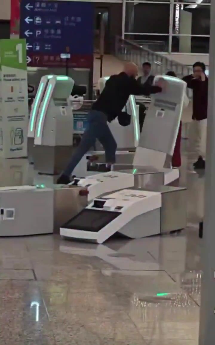 Social media footage showed him toppling kiosks and smashing them with a metal post, damaging around 10 kiosks, railings, and counters at Terminal 1’s Aisle J.