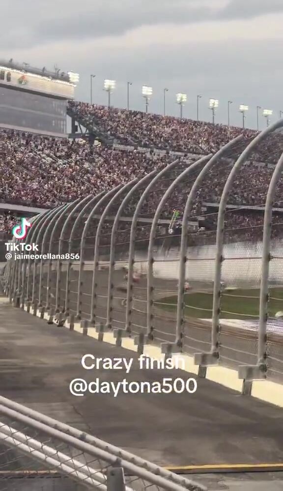 A man appears to throw out someone’s ashes as the Daytona 500 is finishing only to have them blow back in his face