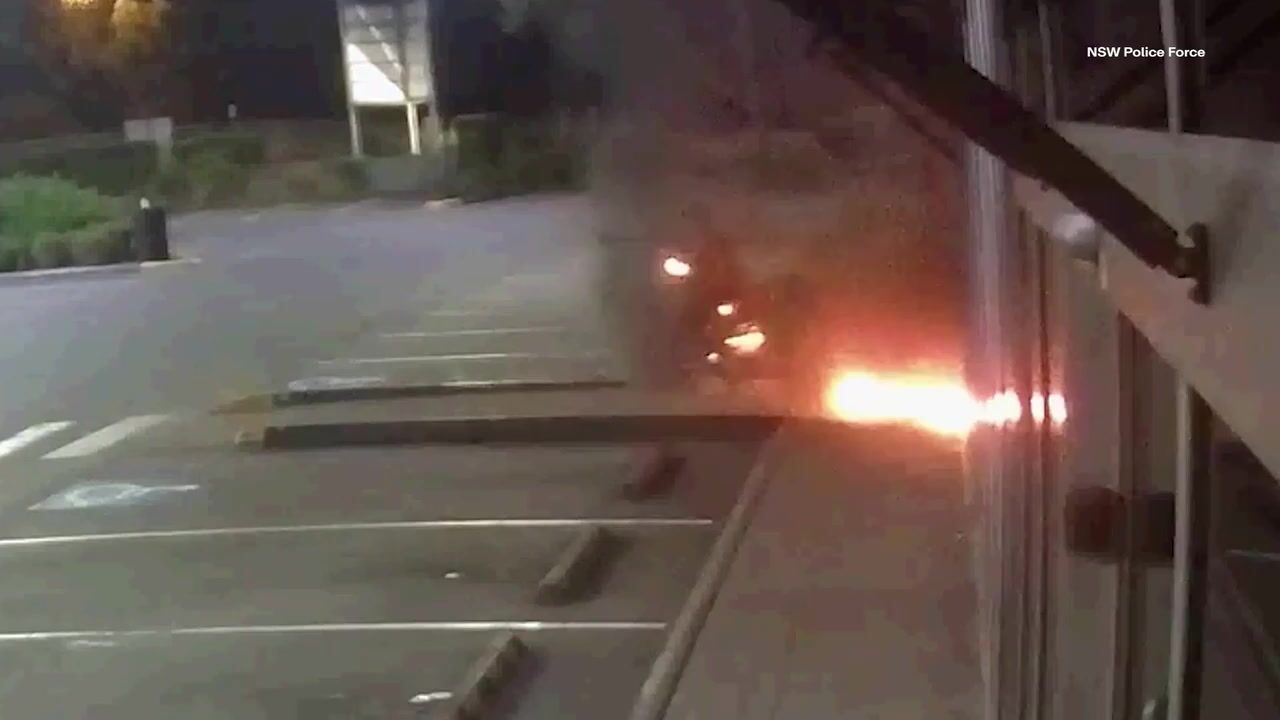 NSW Police released this surveillance footage as part of an appeal for information amid an investigation into the “suspicious” fire. Detectives would like to speak to the two men seen in the CCTV, who were dressed in dark clothing and donned balaclavas.