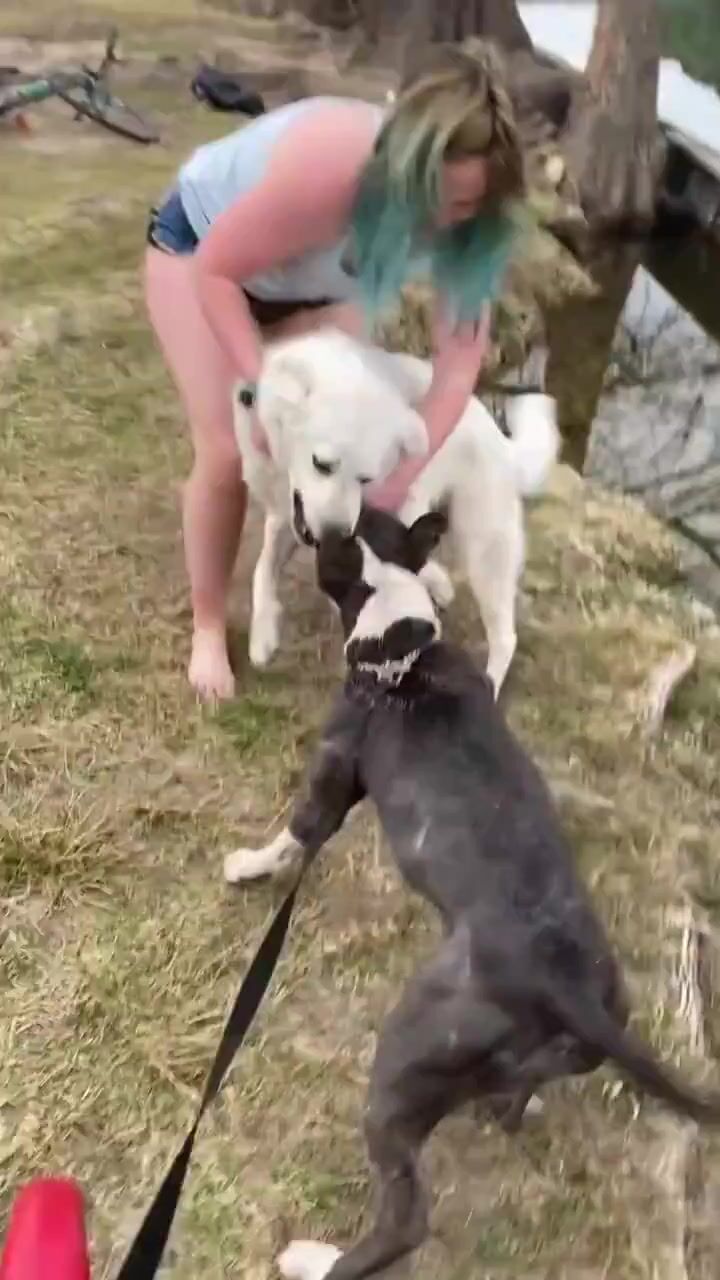 Dogs interact, the fact his pit bull is on a leash means he knows it not safe to roam free because it attacks other dogs, should have stomped the dog dead on the spot