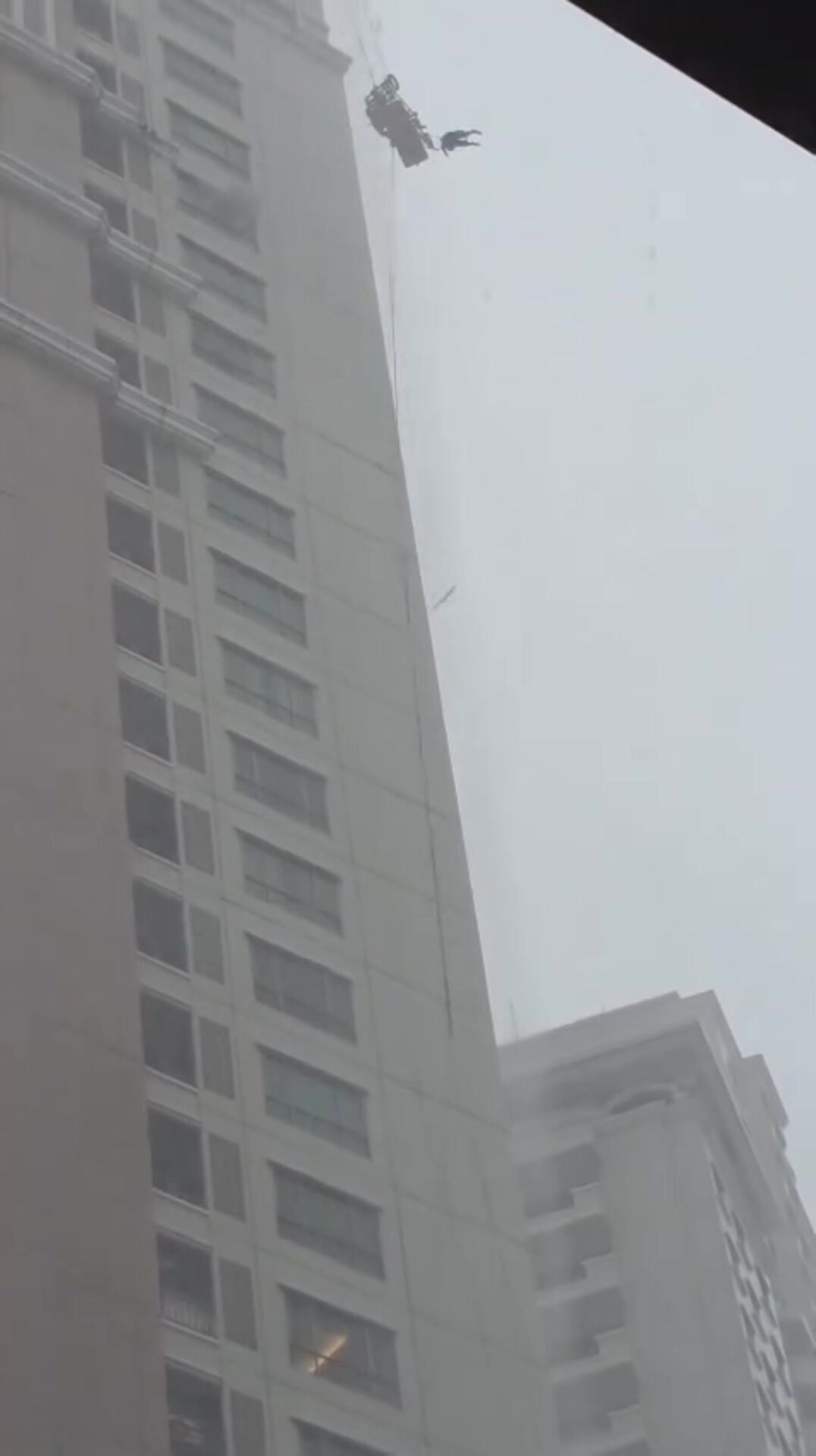 Heavy rain and strong winds caused a workplace accident at an apartment in Surabaya , East Java . Two window cleaners were thrown from a gondola. As a result, one worker died and another was injured.
