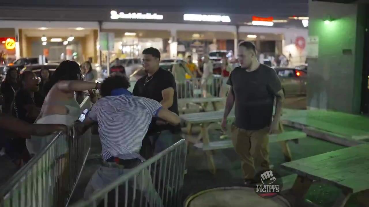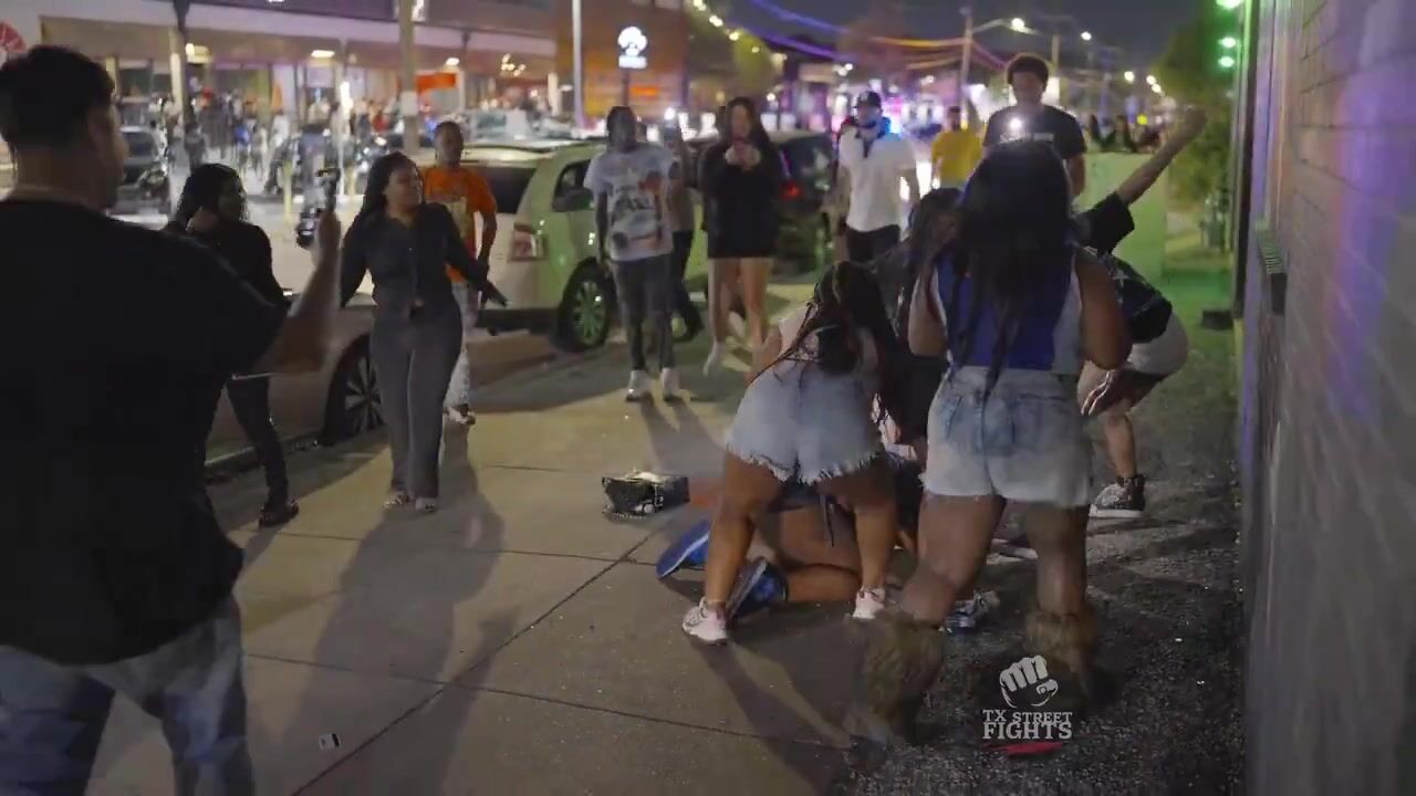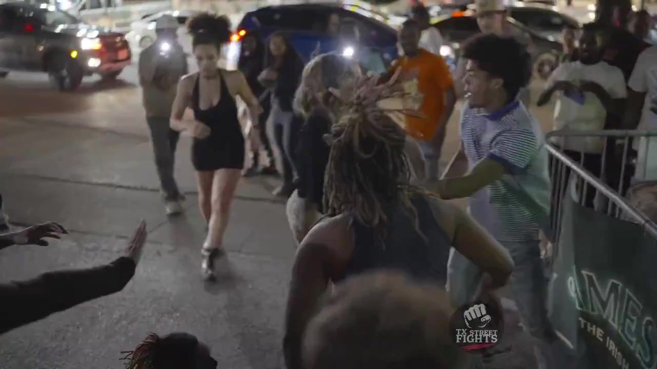 dumb female is being helped to get away from male attacker only to be wanting to jump at him again to be grabbed and slammed and face punched again and again to be helped and she repeats like a fool and then everyone then stares to think she is not worth the time and watch her get face punched in and hair ripped out