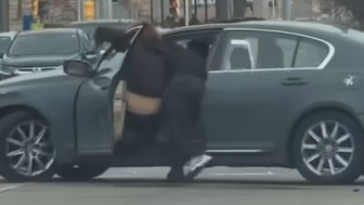 Stolen car victim tracks down the thief and confronts him in the middle of a busy Mil
