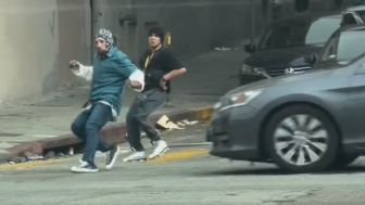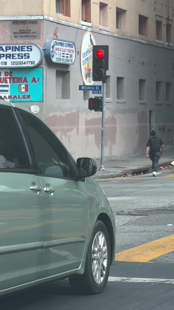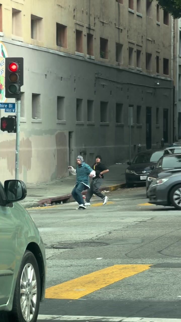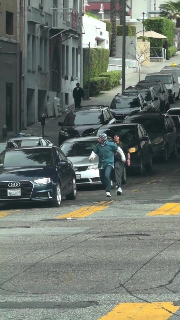 Man gets chased down a street in downtown Los Angeles and ends up getting hit