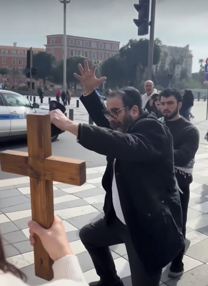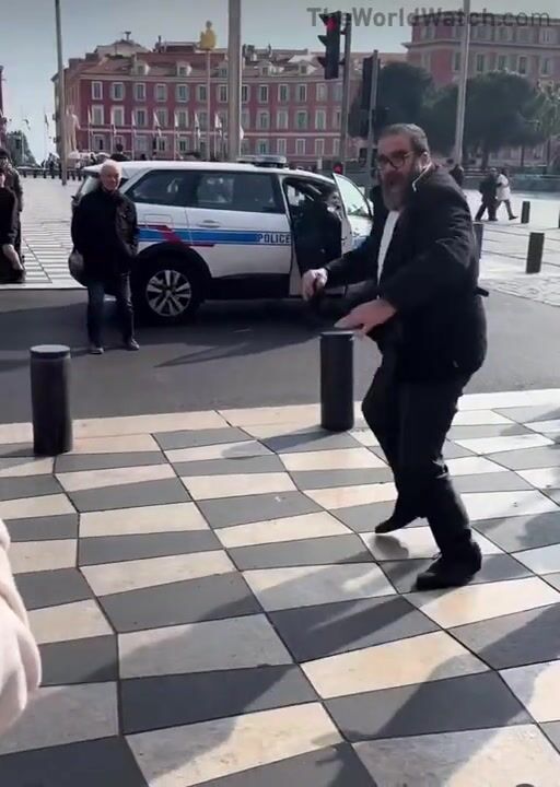 I see a typically Jewish reaction. He simulates an attack, to encourage the police to intervene against demonstrators.