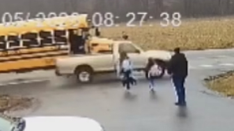 The pickup truck passed between the bus door and the children who were about to board, nearly hitting them.
