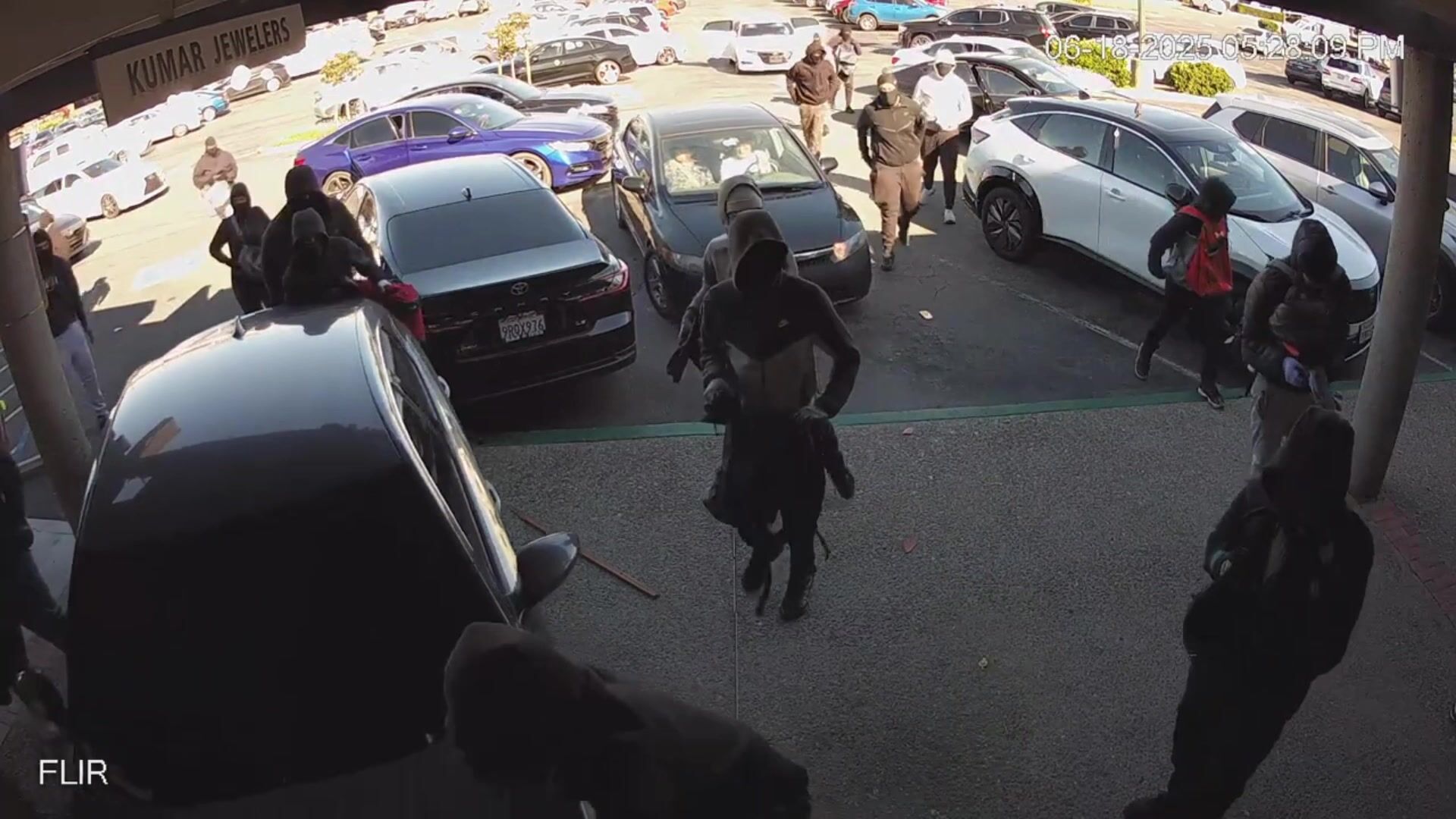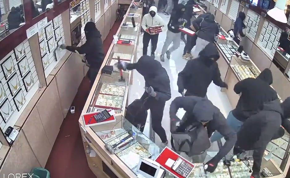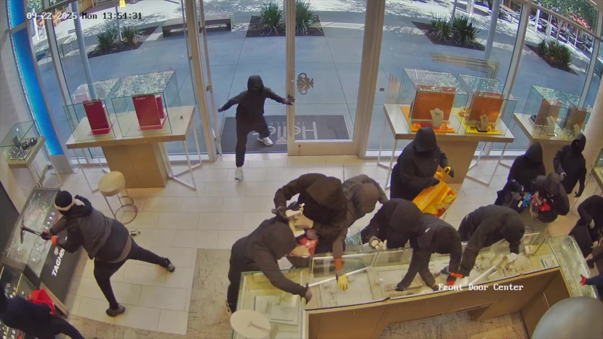 The video, obtained by this news organization through a public records request, shows a seemingly chaotic scene. About two dozen robbers rush into Kumar Jewelers with picks, hammers and backpacks, smashing cases and stuffing their bags while the employees run for cover in the back.