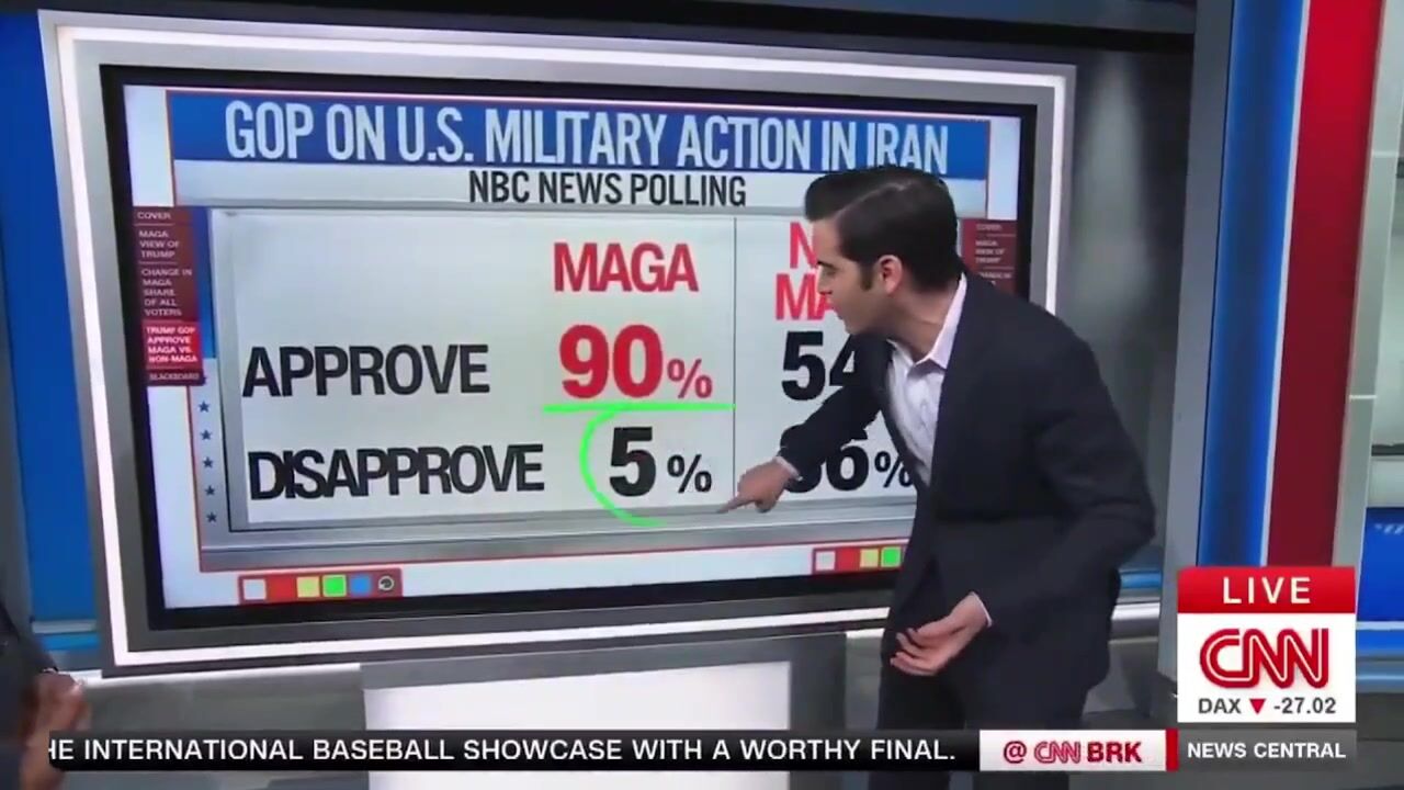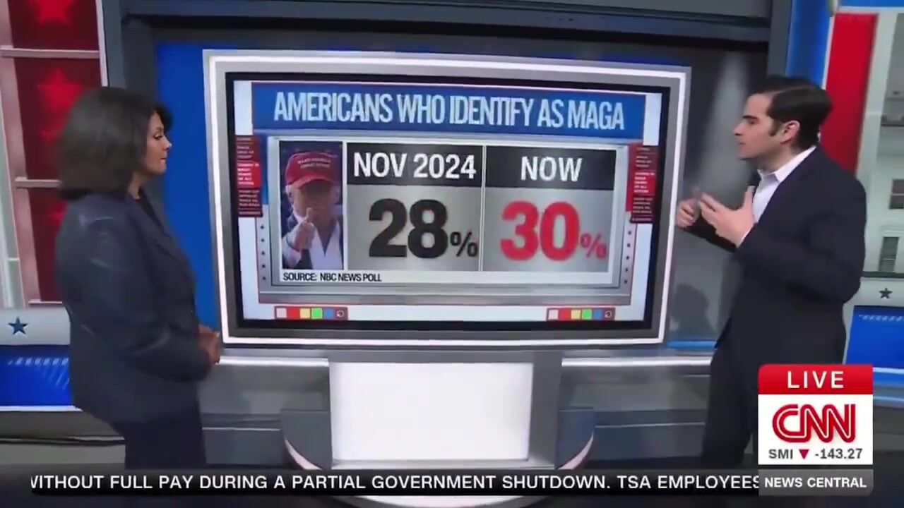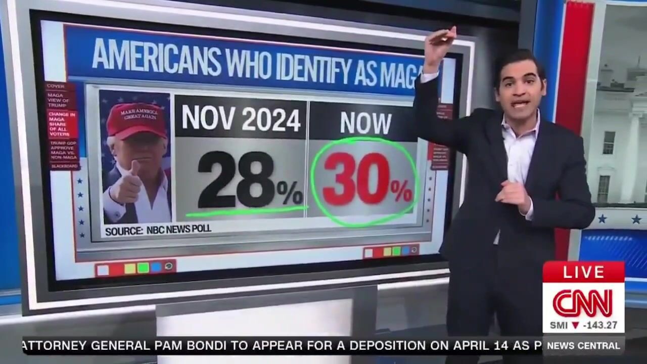 CNN: "In November 2024, 28% were MAGA. It's basically the SAME, 30%! The MAGA base is NOT SHRINKING — it's the SAME SIZE! If anything, it's slightly larger! That 100% that Trump has among MAGA GOP, is NOT an artifact of MAGA shrinking. It's just how strong Trump's grip is on the MAGA base!