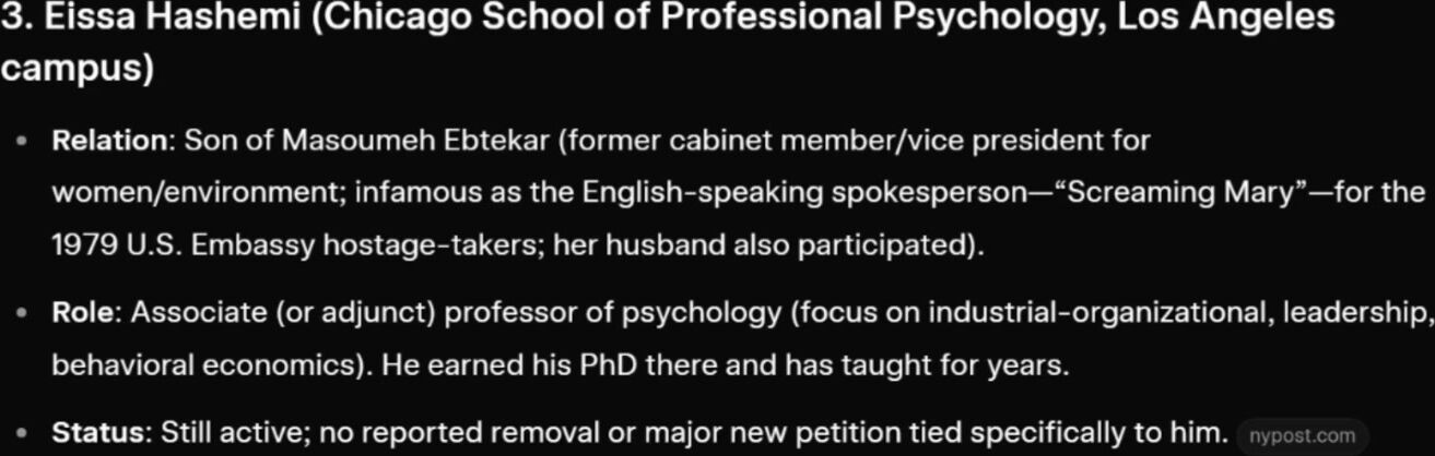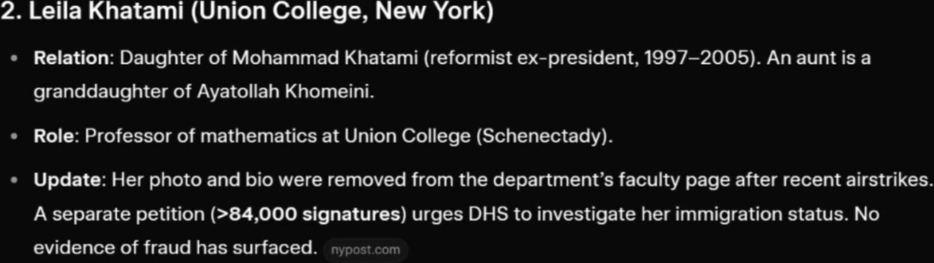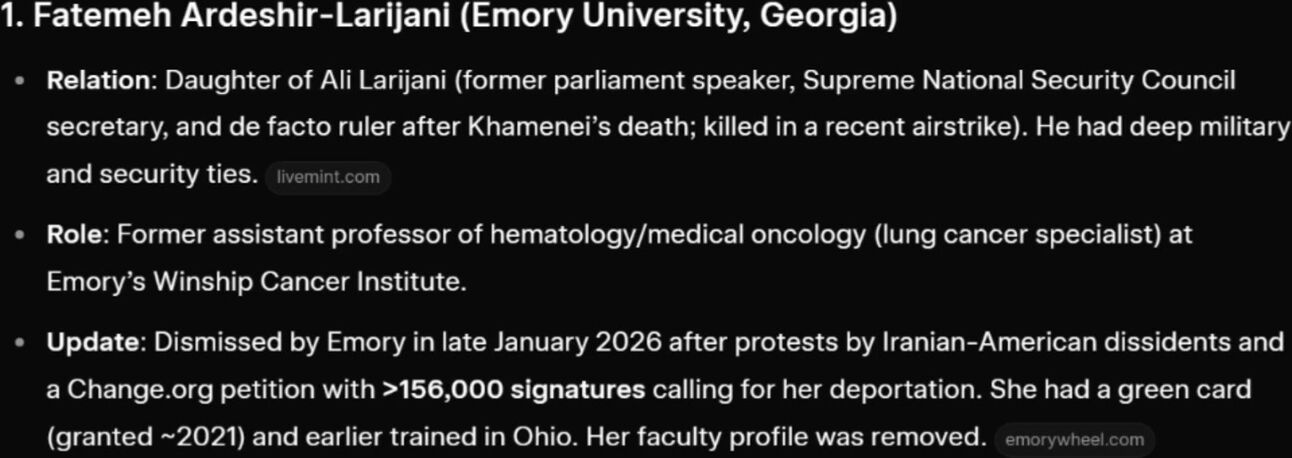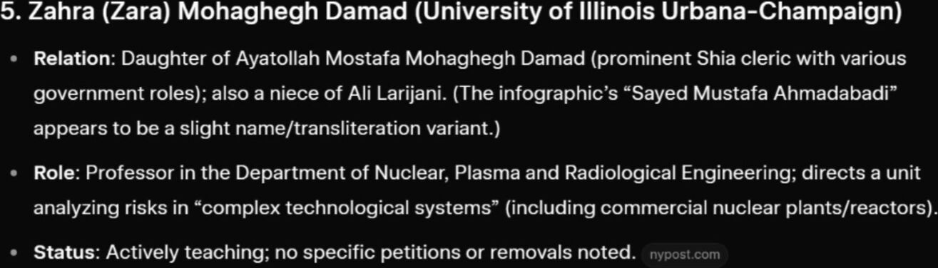 1. Fatemeh Ardeshir-Larijani (Emory University, Georgia) Relation: Daughter of Ali Larijani (former parliament speaker, Supreme National Security Council secretary, and de facto ruler after Khamenei’s death; killed in a recent airstrike). He had deep military and security ties. Role: Former assistant professor of hematology/medical oncology (lung cancer specialist) at Emory’s Winship Cancer Institute. Update: Dismissed by Emory in late January 2026 after protests by Iranian-American dissidents and a Change.org petition with >156,000 signatures calling for her deportation. She had a green card (granted ~2021) and earlier trained in Ohio. Her faculty profile was removed. 2. Leila Khatami (Union College, New York) Relation: Daughter of Mohammad Khatami (reformist ex-president, 1997–2005). An aunt is a granddaughter of Ayatollah Khomeini. Role: Professor of mathematics at Union College (Schenectady). Update: Her photo and bio were removed from the department’s faculty page after recent airstrikes. A separate petition (>84,000 signatures) urges DHS to investigate her immigration status. No evidence of fraud has surfaced. 3. Eissa Hashemi (Chicago School of Professional Psychology, Los Angeles campus) Relation: Son of Masoumeh Ebtekar (former cabinet member/vice president for women/environment; infamous as the English-speaking spokesperson—“Screaming Mary”—for the 1979 U.S. Embassy hostage-takers; her husband also participated). Role: Associate (or adjunct) professor of psychology (focus on industrial-organizational, leadership, behavioral economics). He earned his PhD there and has taught for years. Status: Still active; no reported removal or major new petition tied specifically to him. 4. Zeinab Hajjarian (University of Massachusetts Lowell) Relation: Daughter of Saeed Hajjarian (co-founder of Iran’s Ministry of Intelligence in 1983; key post-revolution security figure and Khomeini adviser; later positioned himself as a “reformist” strategist). Role: Assistant professor of biomedical engineering. Status: Still teaching; highlighted in dissident commentary questioning loyalty given her father’s intelligence apparatus role. 5. Zahra (Zara) Mohaghegh Damad (University of Illinois Urbana-Champaign) Relation: Daughter of Ayatollah Mostafa Mohaghegh Damad (prominent Shia cleric with various government roles); also a niece of Ali Larijani. (The infographic’s “Sayed Mustafa Ahmadabadi” appears to be a slight name/transliteration variant.) Role: Professor in the Department of Nuclear, Plasma and Radiological Engineering; directs a unit analyzing risks in “complex technological systems” (including commercial nuclear plants/reactors). Status: Actively teaching; no specific petitions or removals noted. 6. Ehsan Nobakht (George Washington University, Washington, D.C.) Relation: Son of Ali Nobakht (renowned physician, reformist former parliamentarian, and ex-deputy minister in Iran’s Health Department). Role: Associate professor of medicine at GWU School of Medicine, specializing in kidney disease and hypertension. Status: Still active; no major controversies or actions reported beyond family ties.