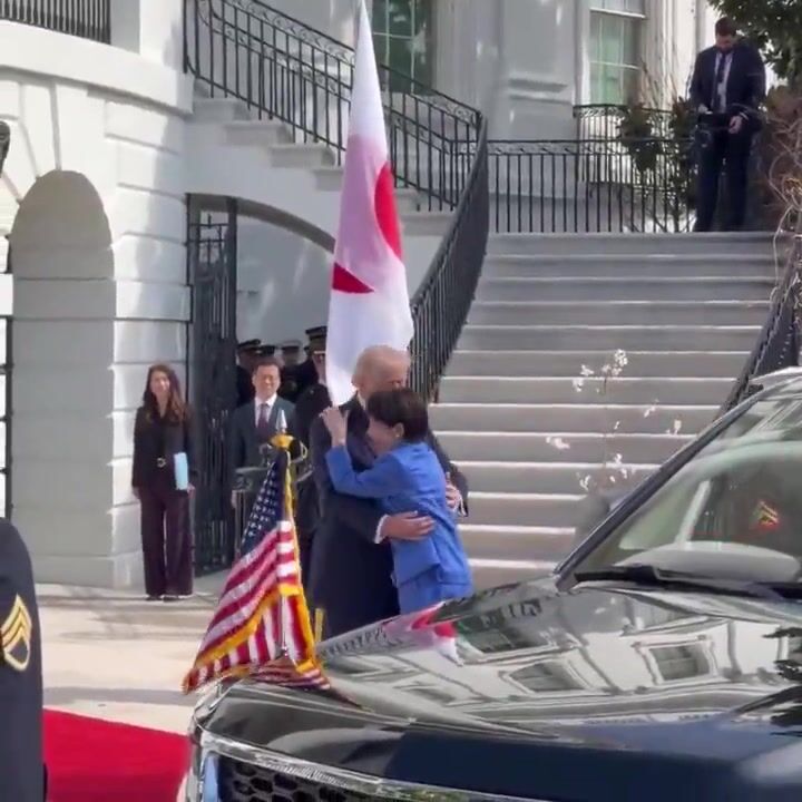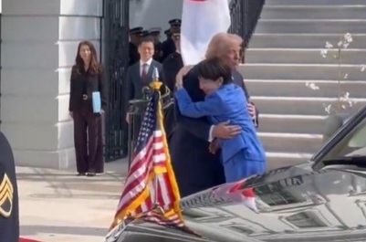 Incredible moment as President Trump welcomes Japan's right-wing Prime Minister Sanae Takaichi with a WARM HUG at the White House