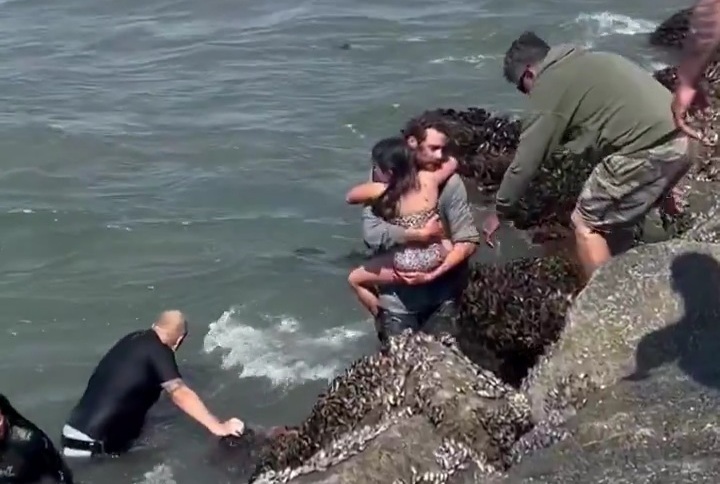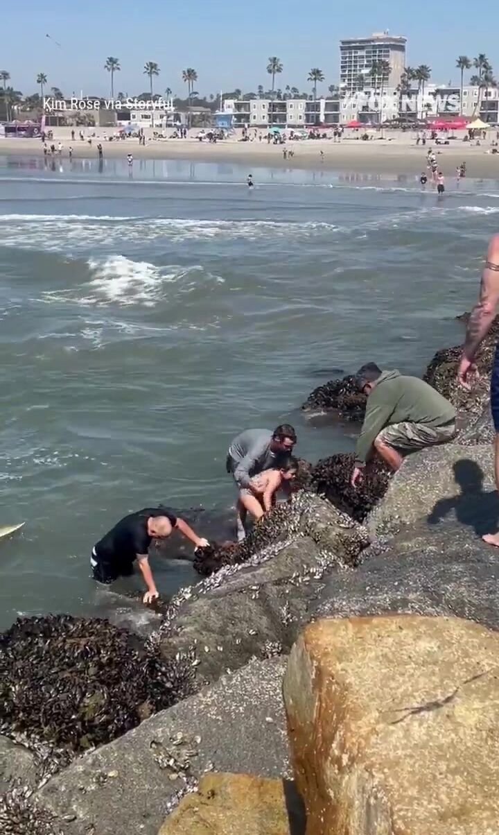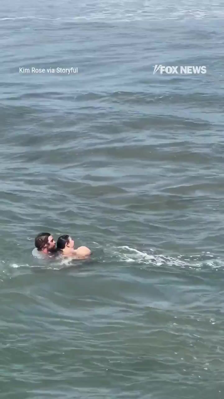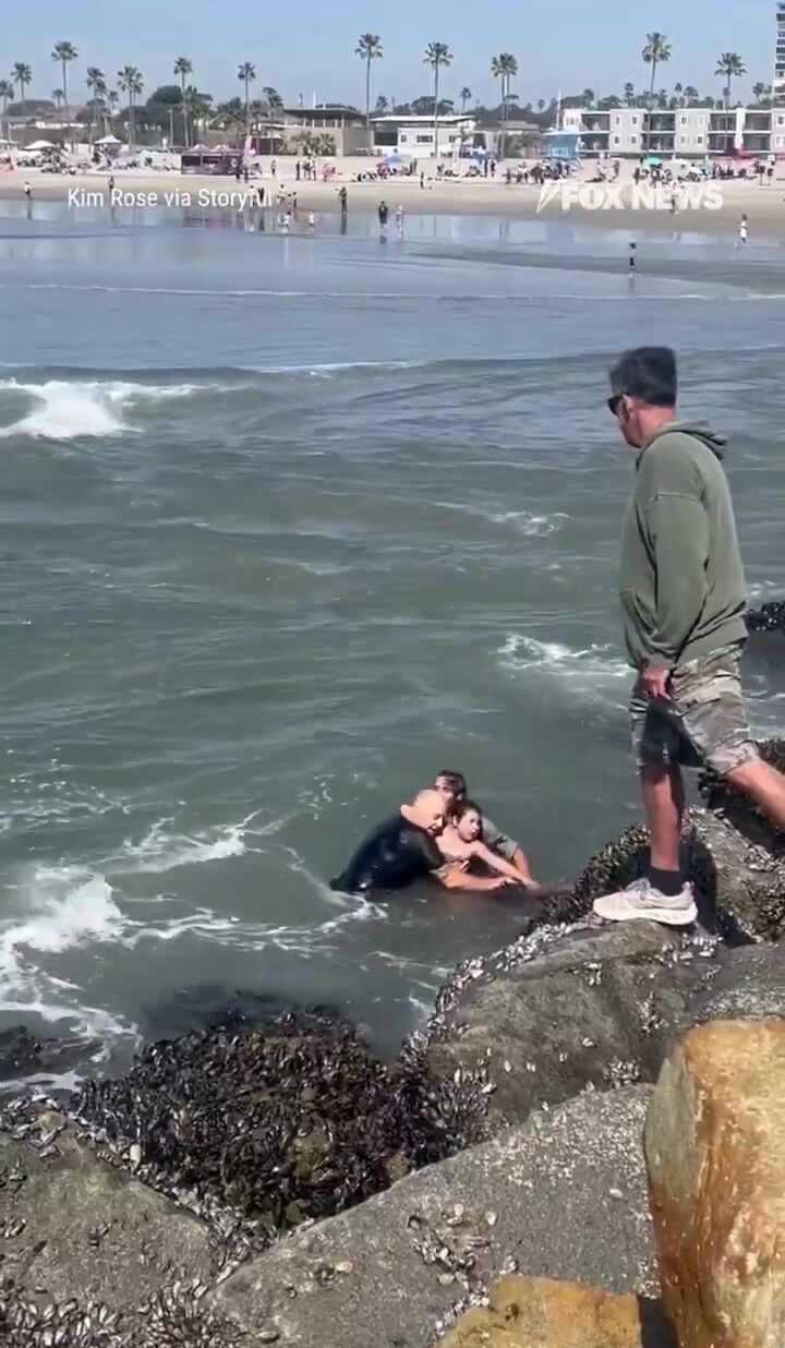 The pair were struggling to stay afloat before the coach dove into the water without hesitation and brought them to shore, where other bystanders waited to lend a hand.