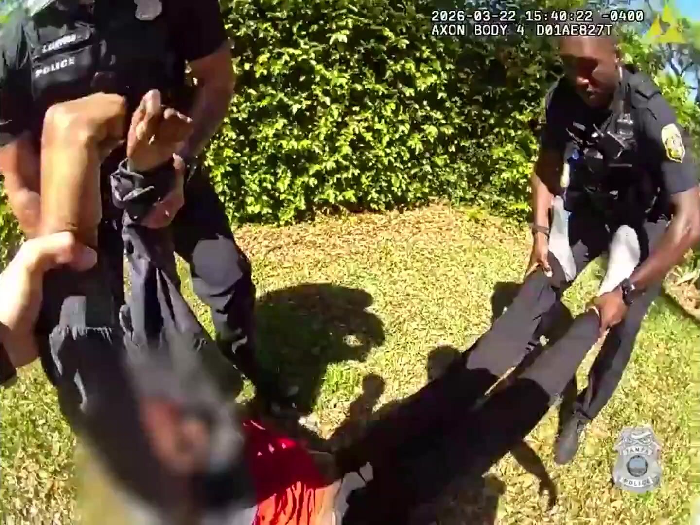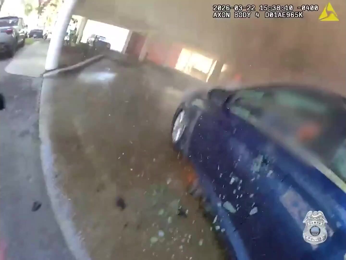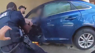 Police in Tampa, FL, breaking a car window to rescue a man inside the burning car