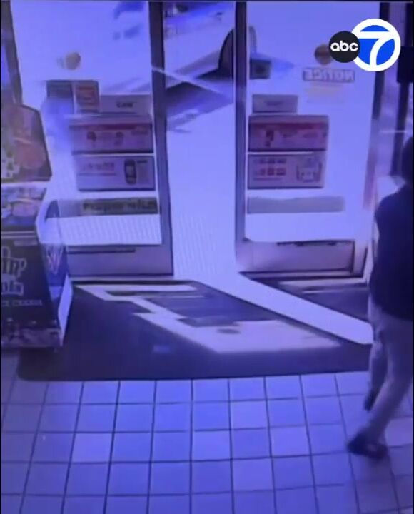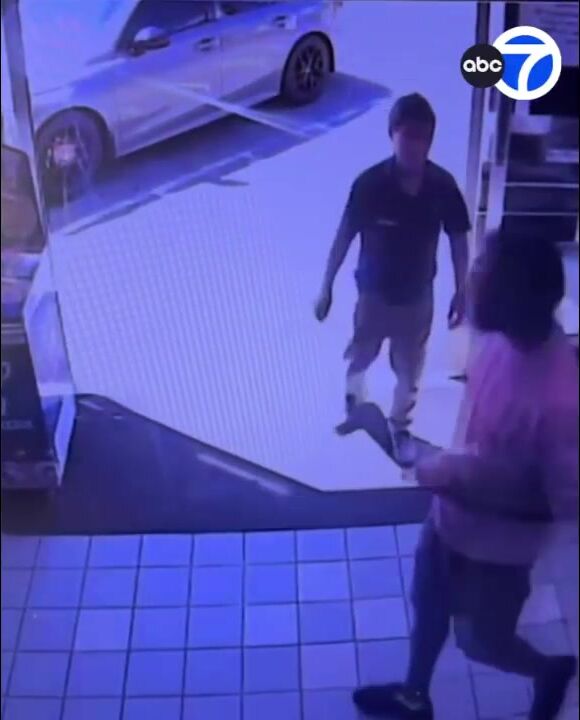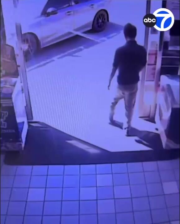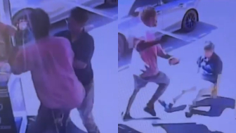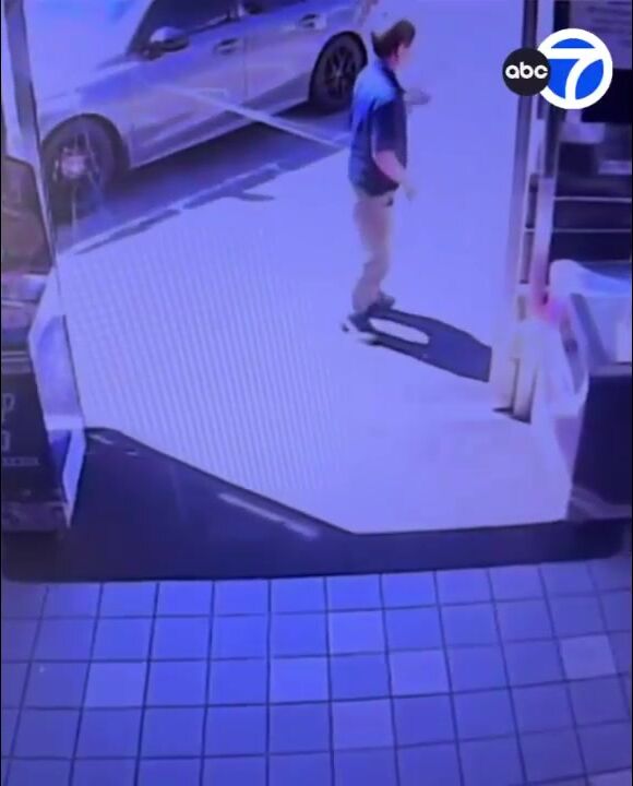 Surveillance video shows a man in a pink shirt taking a drink from a store cooler. When he begins to walk out without paying, the Chevron employee is knocked to the ground. Moments later, another employee rushes to help the injured man.