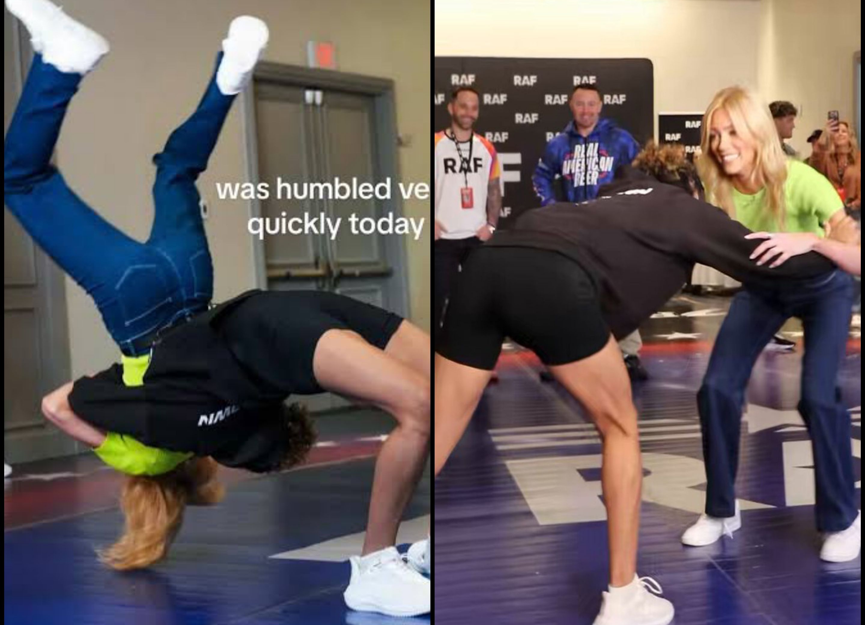 She pops right up: “I don’t think I can be a wrestler… The mic pack did not survive!”