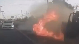 Security camera footage showed the truck, a white pickup, zigzagging on the highway after the blast before colliding with a concrete divider.
