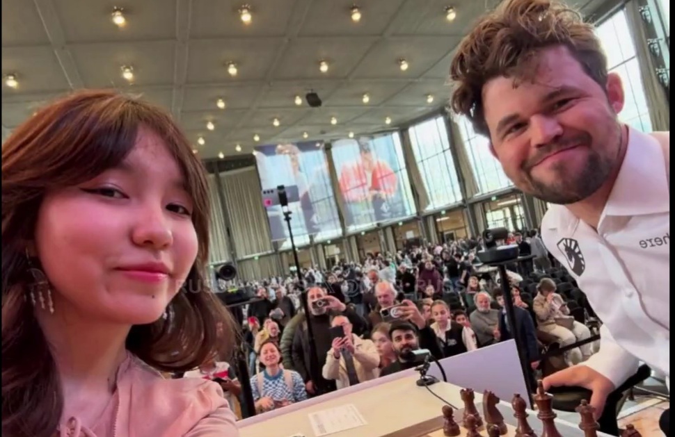 Norwegian chess champion Magnus Carlsen, with a wide smile, agreed to take a "selfie" with Kazakhstani player Alua Norman's phone before the second round.
