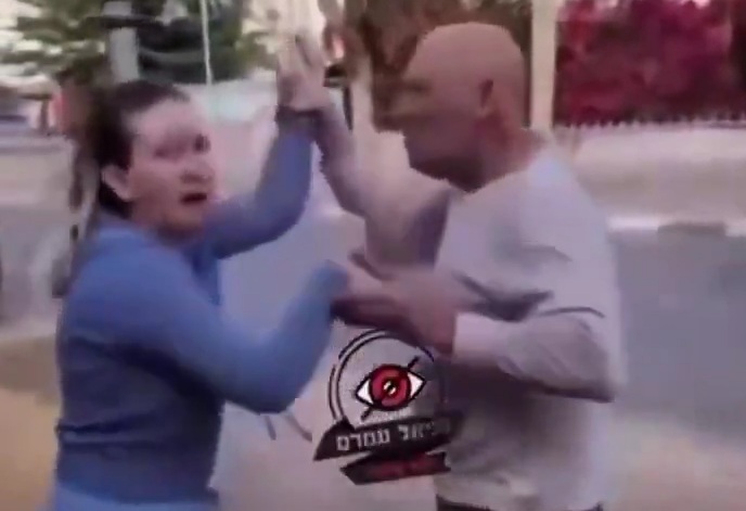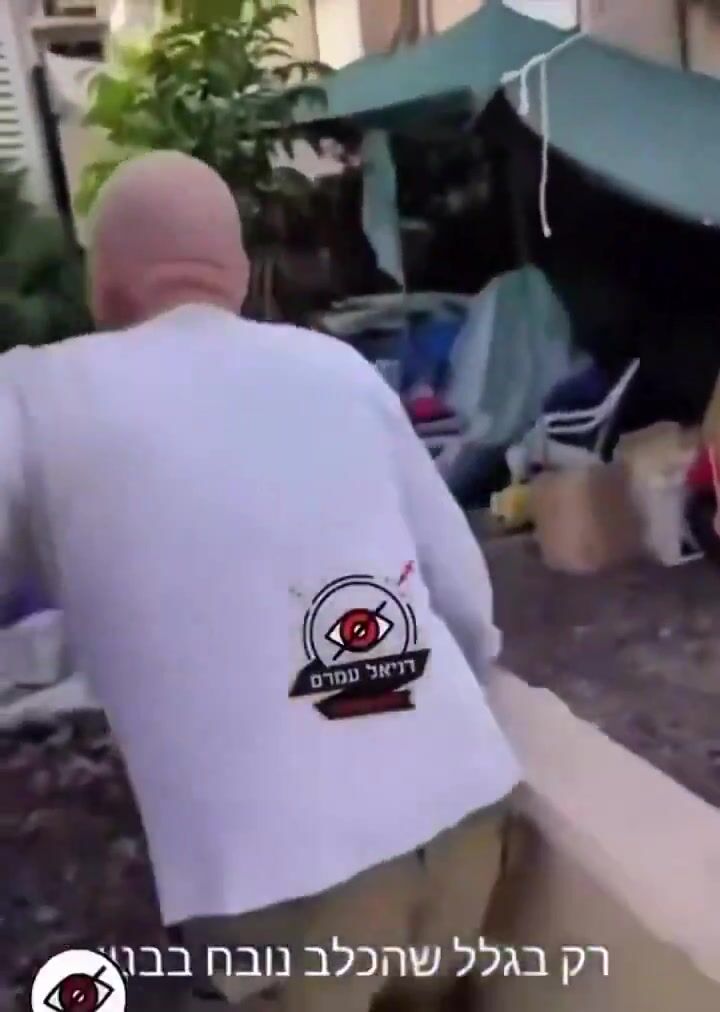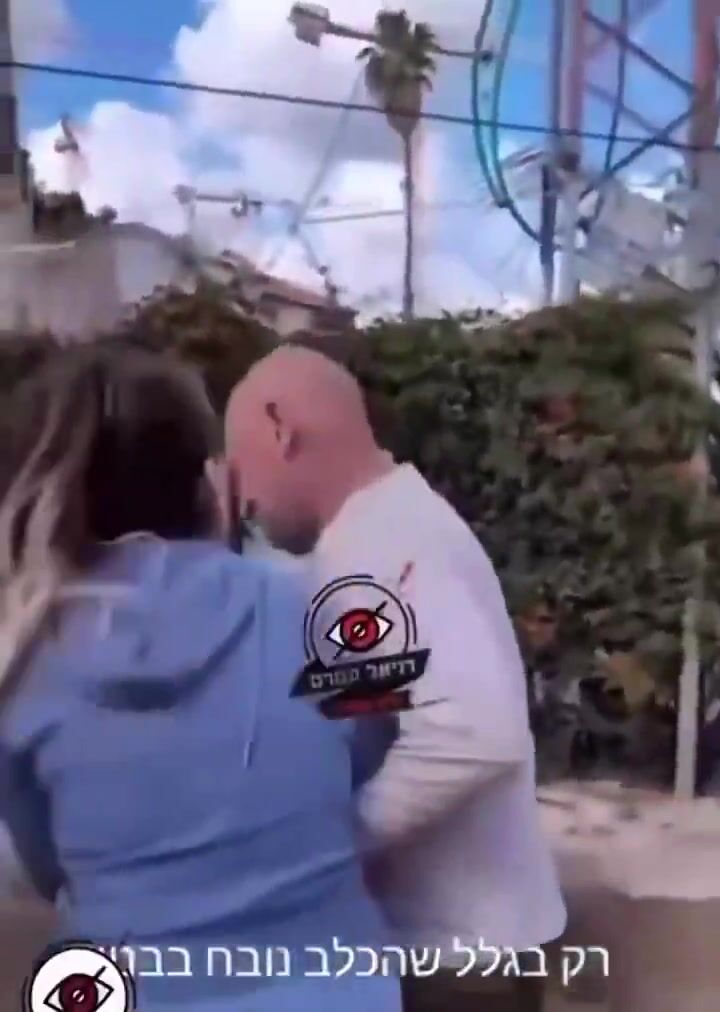An Israeli man blocks a woman from entering a shelter because she has a dog.