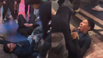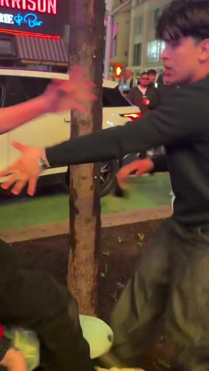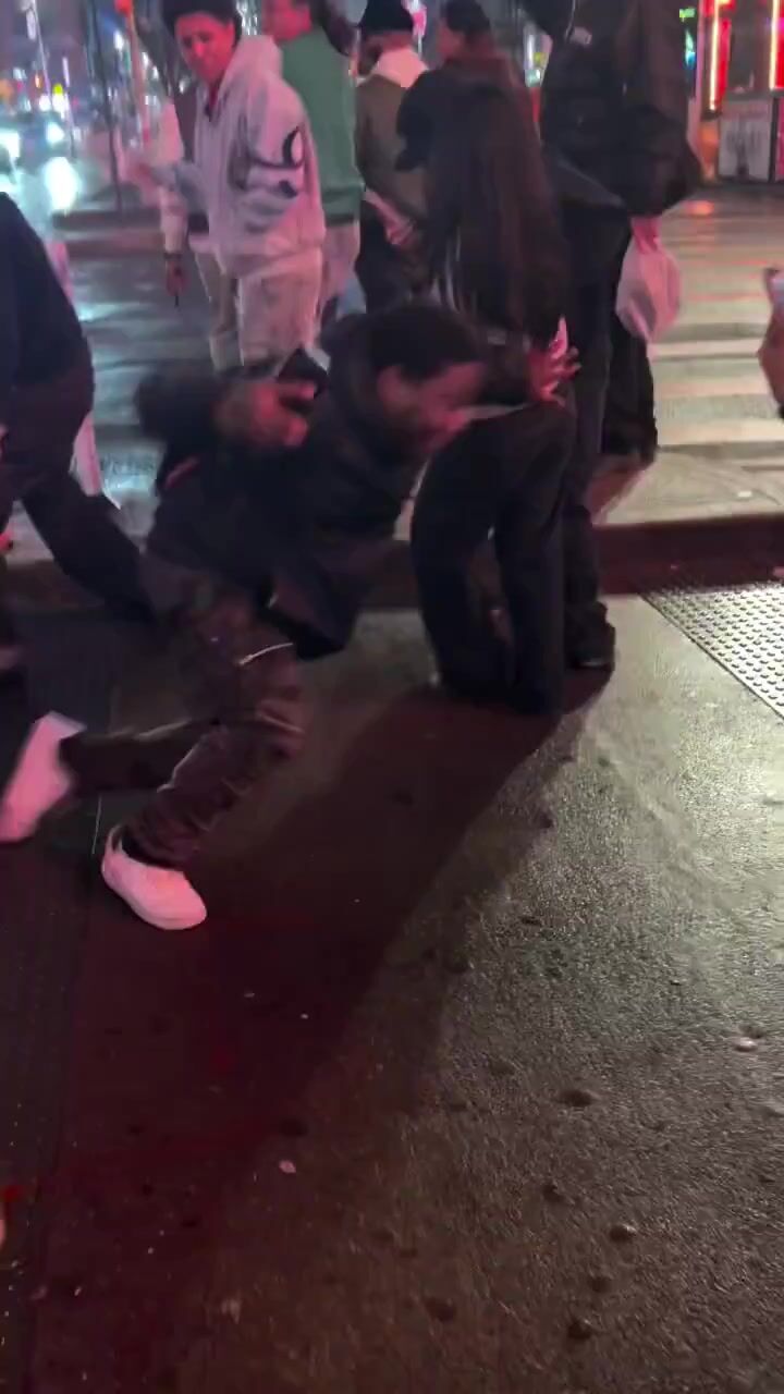 A massive brawl breaks out between two parties in Times Square