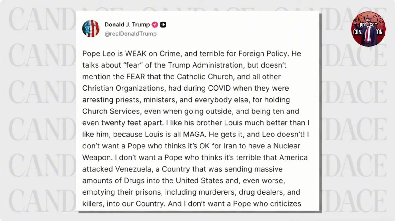 The Papal Feud: Trump’s claim that Pope Leo XIV was only elected to "deal with Trump" is, in Candace's view, the height of unhinged narcissism.
